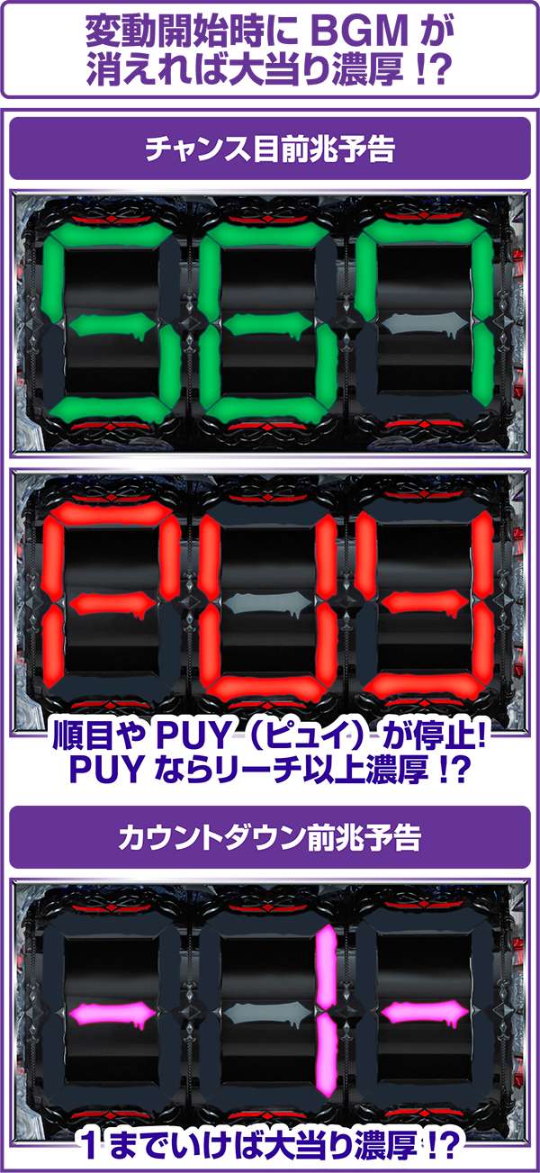 チャンス目前兆予告は停止出目が「789」なら7図柄テンパイ濃厚となり、「112」などのテンパイ+1のリーチ目なら大当り濃厚!?