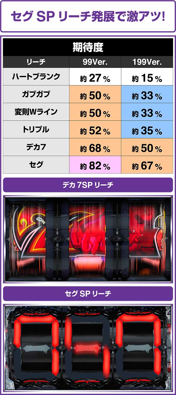 SEGラッシュ予告は、出現で変則WラインSPリーチ発展。ラッシュ回数が9回を越えるとSPリーチに発展せず、そのまま7が揃い大当り!?