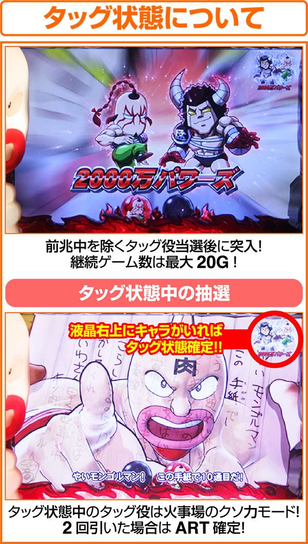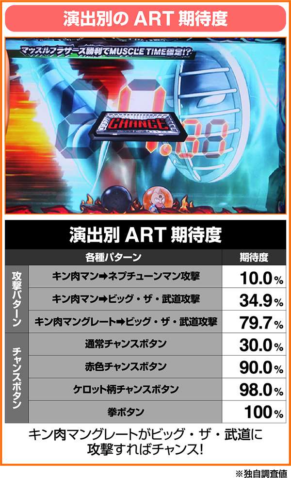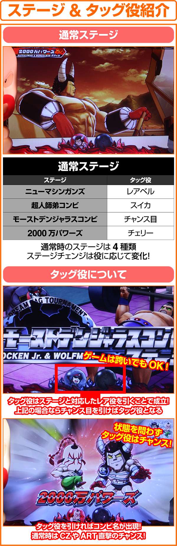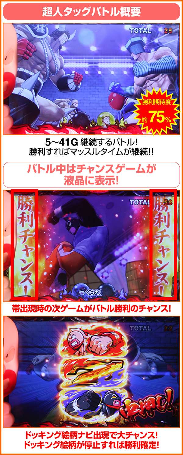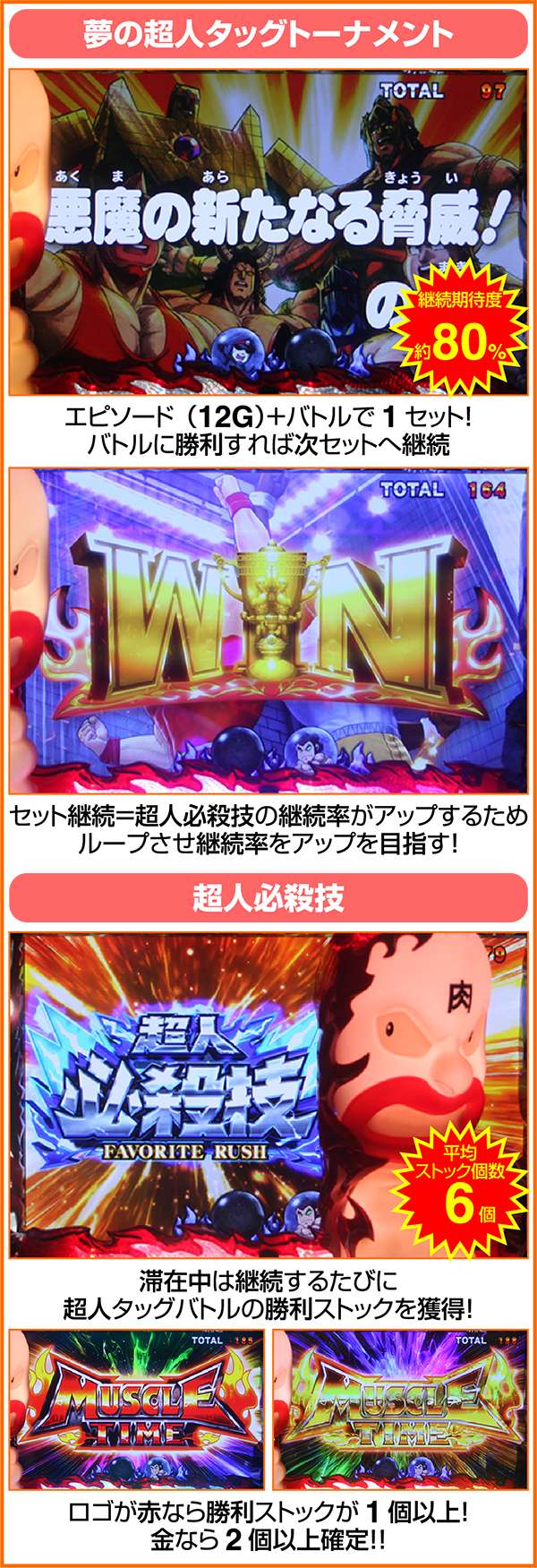初代のARTシステムを継承・進化させ、再びリングイン。 通常時は同じレア役を連続で引くことで成立するタッグ役などでCZやARTを目指す。出玉増加のメインとなるART「マッスルタイム」は1Gの純増が約2.0枚。マッスルタイムはバトル目成立で突入する超人タッグバトルまで継続。バトルに勝利すればARTが継続するといった流れとなる。バトルの勝率は約75%と高いだけでなく、複数の上乗せ要素も存在! |