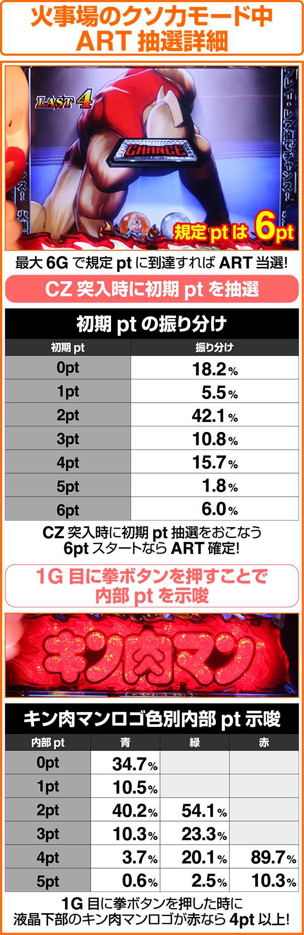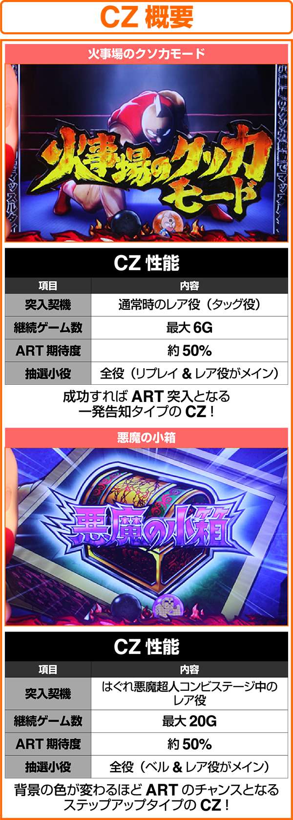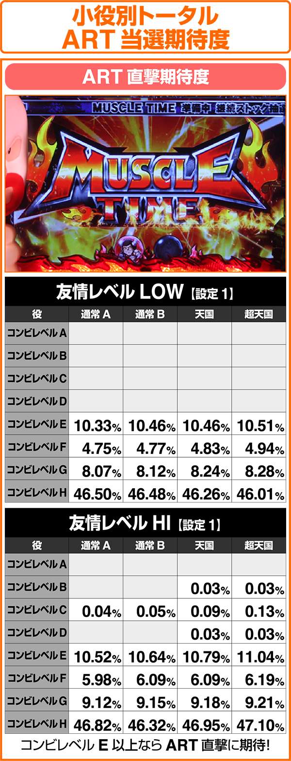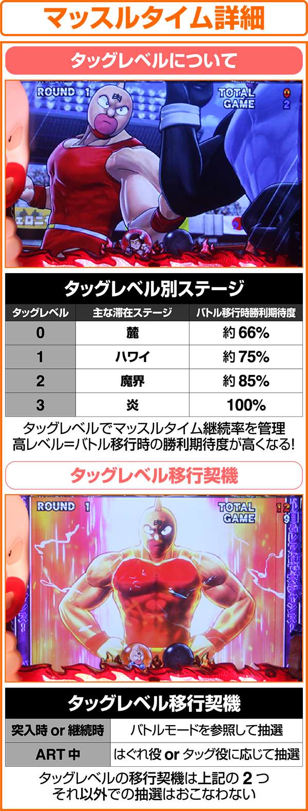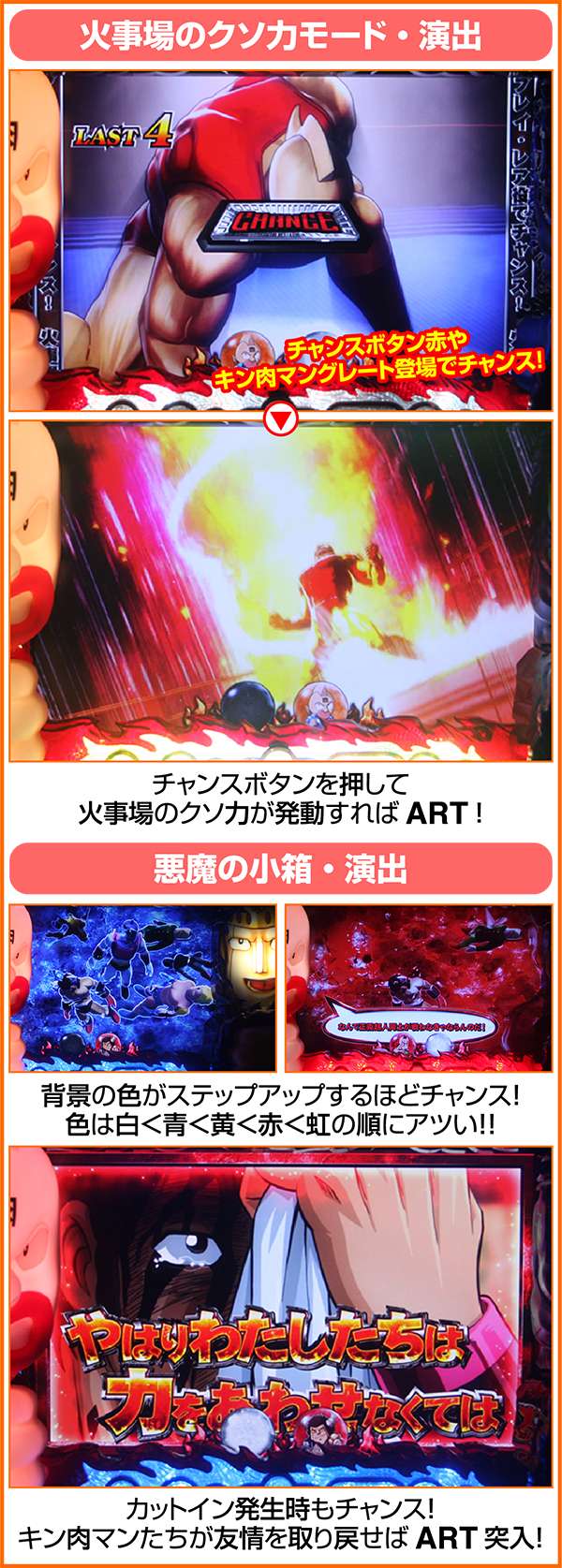 初代のARTシステムを継承・進化させ、再びリングイン。 通常時は同じレア役を連続で引くことで成立するタッグ役などでCZやARTを目指す。出玉増加のメインとなるART「マッスルタイム」は1Gの純増が約2.0枚。マッスルタイムはバトル目成立で突入する超人タッグバトルまで継続。バトルに勝利すればARTが継続するといった流れとなる。バトルの勝率は約75%と高いだけでなく、複数の上乗せ要素も存在! |