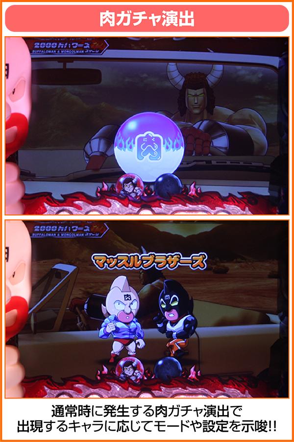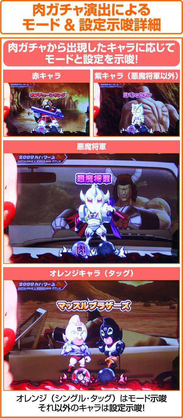 肉ガチャ演出は通常時にのみ発生する演出で、発生時は出現するキャラと文字色に注目。オレンジのキャラはモード示唆(シングル<タッグ)で、オレンジ以外のキャラは設定示唆となる。