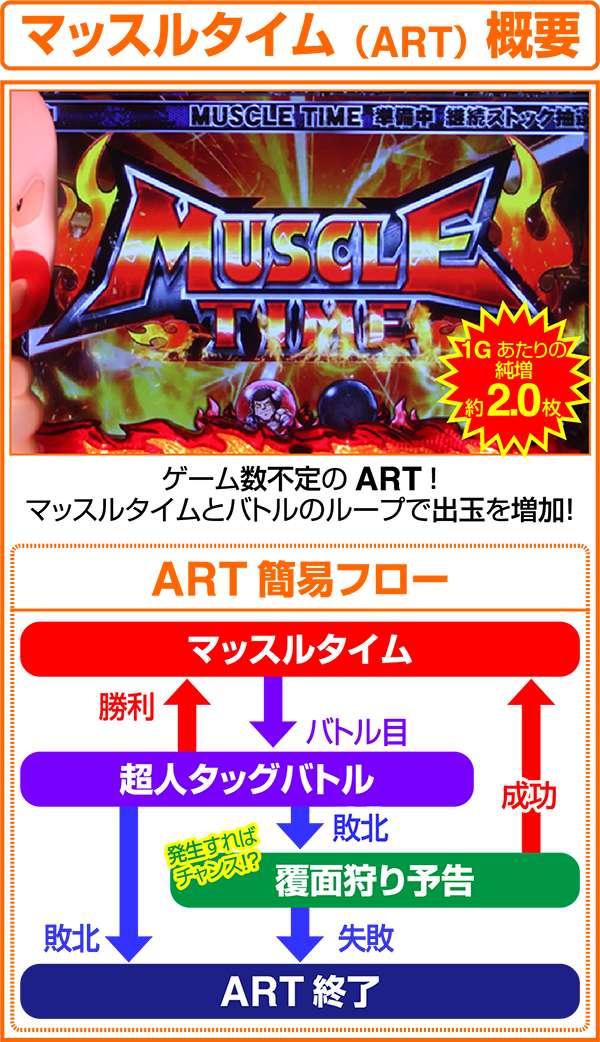 ART中はバトル目(MB)に当選するまではマッスルタイムに滞在し続ける。バトル目に当選後は超人タッグバトルが発生し、ARTの継続をかけたバトルが展開。バトルに勝利すれば再びマッスルタイムに移行し、バトル目を引くまで滞在するという流れとなっている。