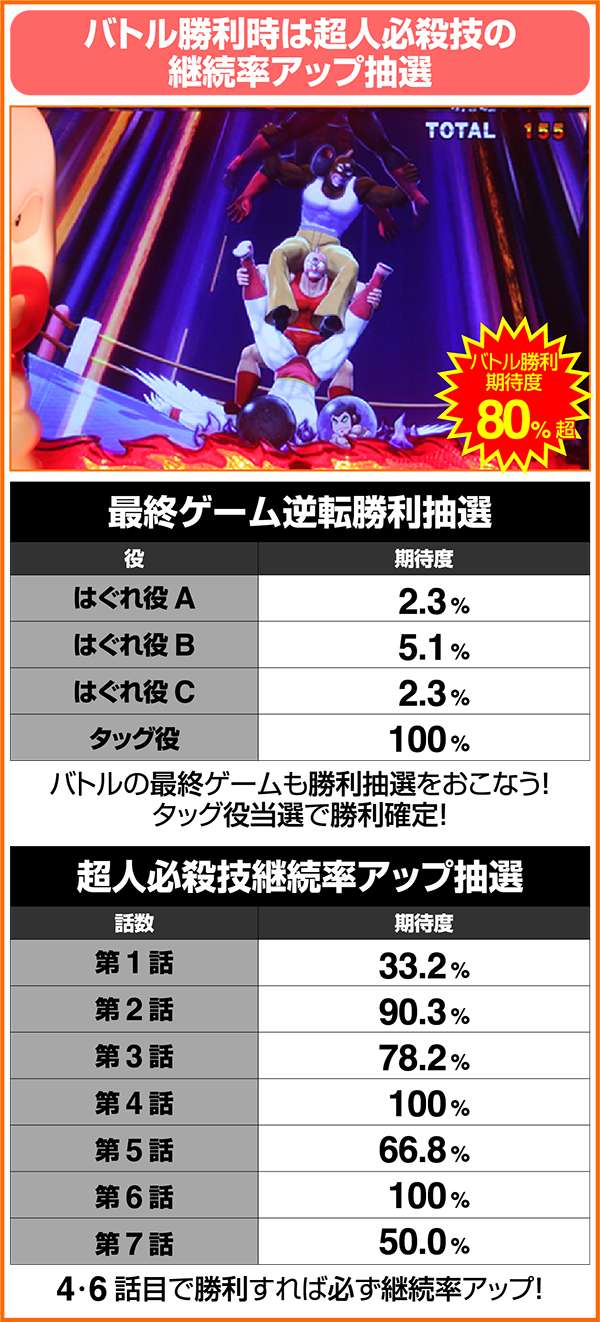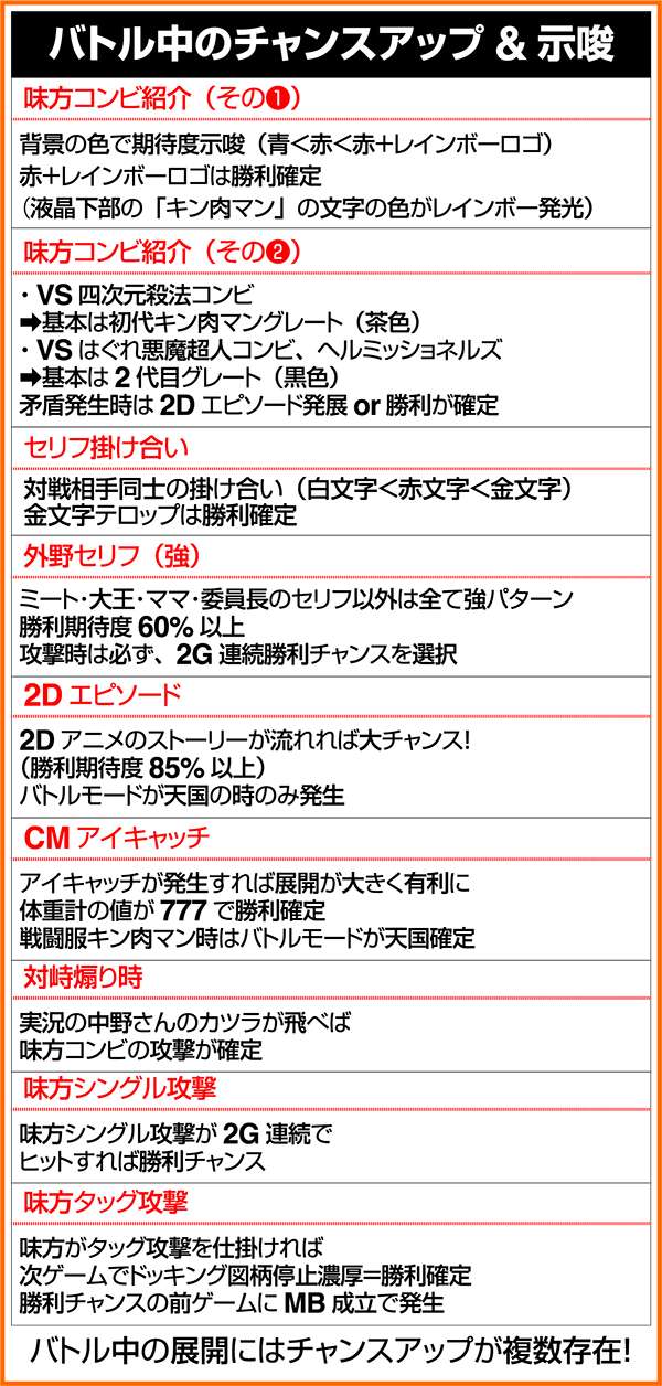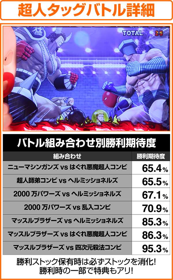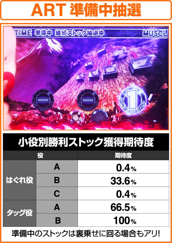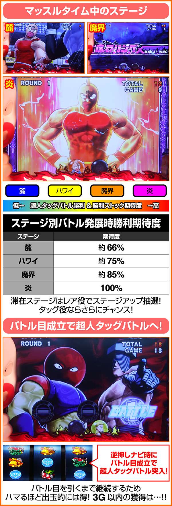 ハマリ=出玉的にお得感といったシンプルな要素だけではなく、マッスルタイム突入から3G以内にバトル目を引いた時の超人タッグバトルで勝利できれば特典があるなど、秘密も存在。ステージの状態も含め、バトル目をいつ引くかがポイントとなるのだ。