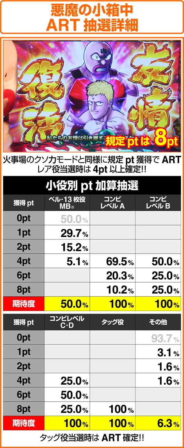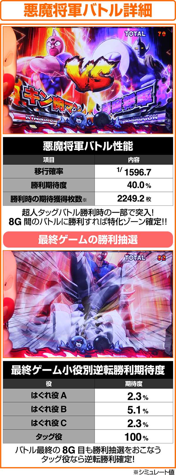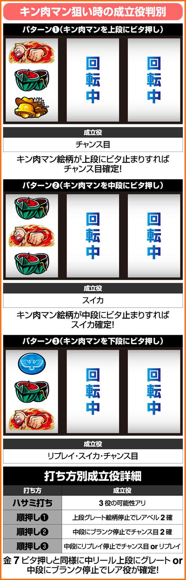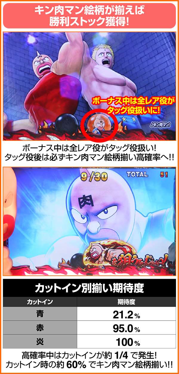 ハマリ=出玉的にお得感といったシンプルな要素だけではなく、マッスルタイム突入から3G以内にバトル目を引いた時の超人タッグバトルで勝利できれば特典があるなど、秘密も存在。ステージの状態も含め、バトル目をいつ引くかがポイントとなるのだ。