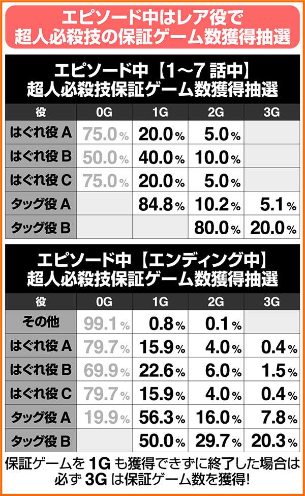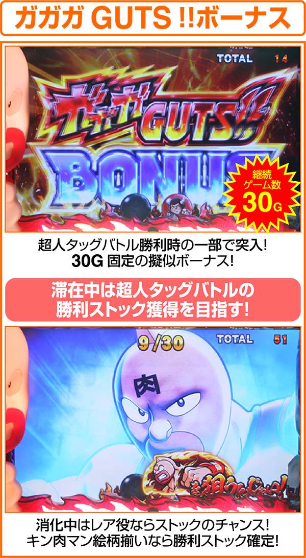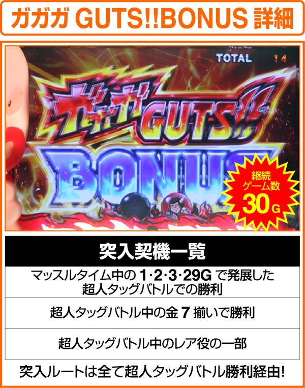 ガガガGUTS!!BONUSの30G目のレア役成立は、超人タッグバトルの勝利ストック獲得が確定。また、29G目にチャンス目MBが成立した時も同様に勝利ストックが確定する。