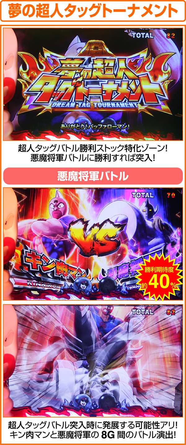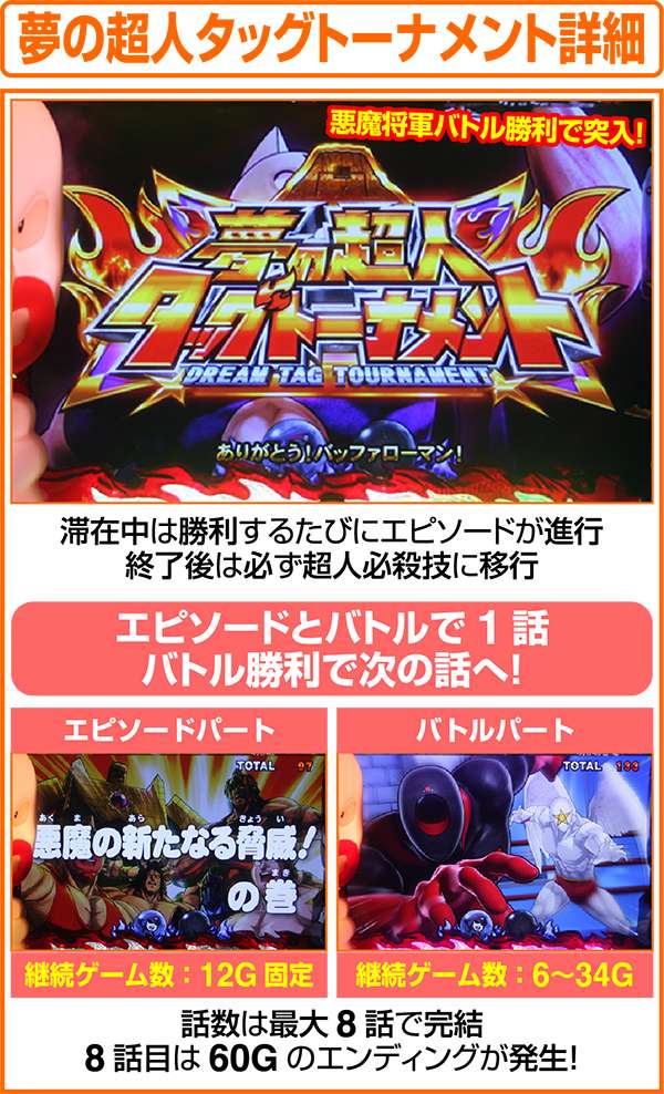 夢の超人タッグトーナメントはエピソード消化後にバトルに発展。バトルに勝利できれば継続し、次のエピソードに移行する。エピソード中は、超人必殺技の保証ゲーム数獲得抽選をおこない、バトルは勝利するごとに、超人必殺技の継続率アップ抽選をおこなう。