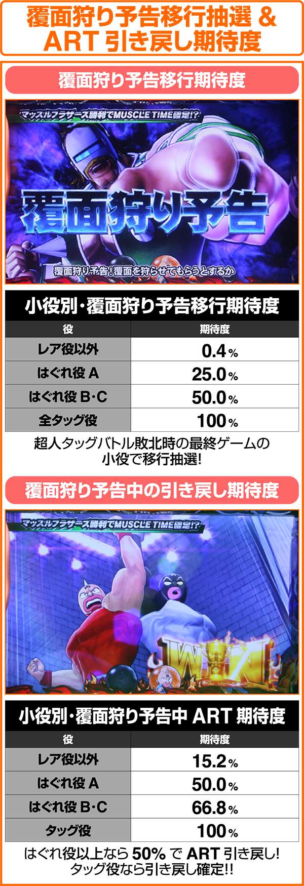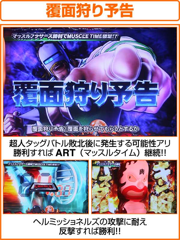 超人タッグバトルの最終ゲームで超人フェイスビジョンにテリーマンが出現すれば、覆面狩り予告移行が確定。覆面狩り予告は最大6G継続し、滞在中は小役を引くことでART引き戻しのチャンスとなる。