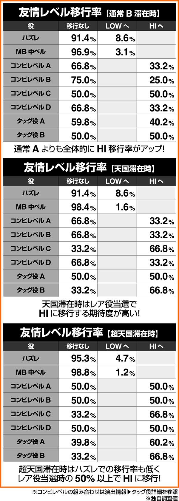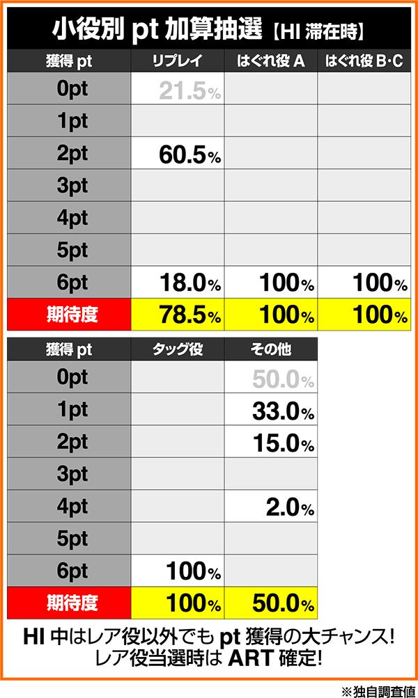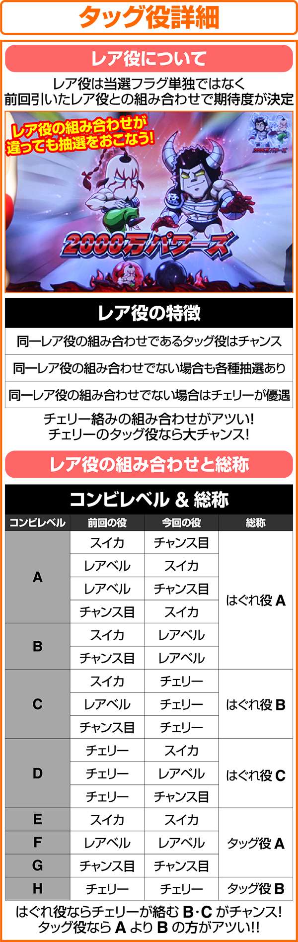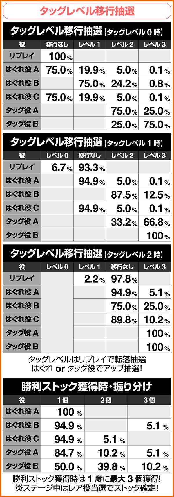 また、タッグレベルは小役に応じて移行しており、はぐれ役orタッグ役で昇格抽選、リプレイで転落抽選をおこなっている。