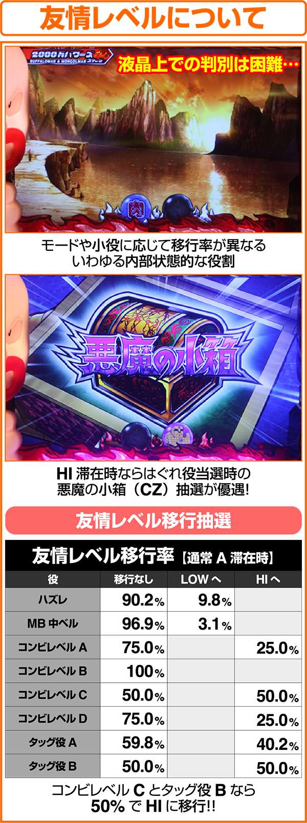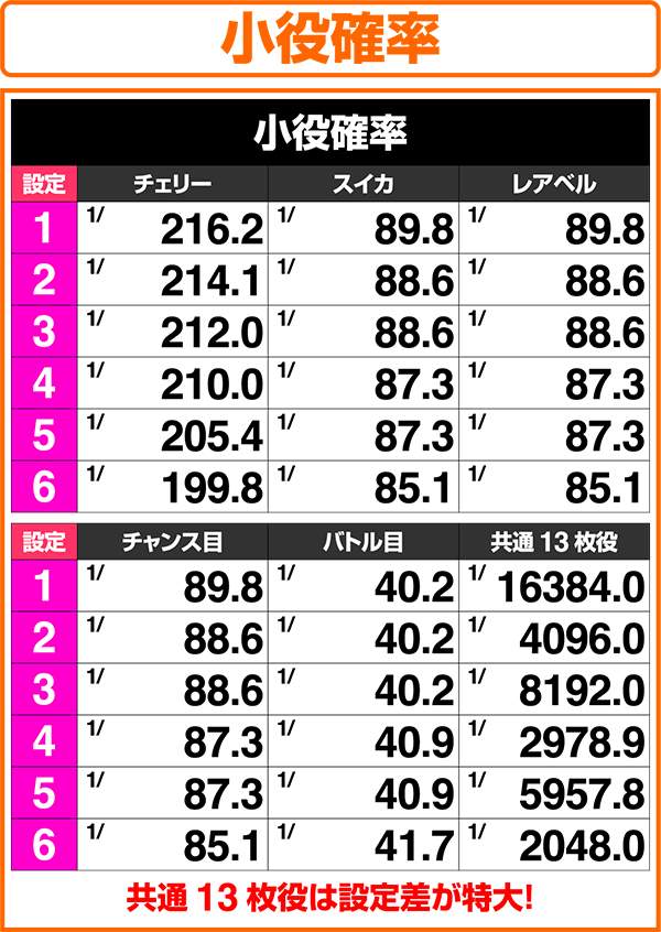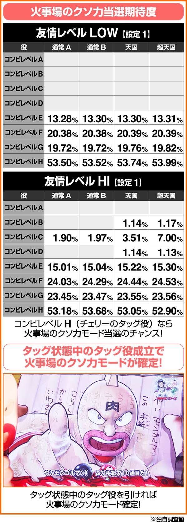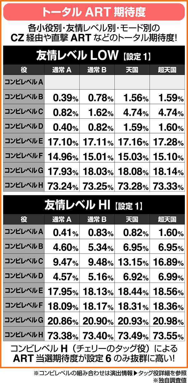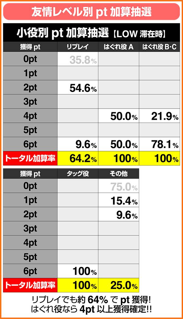 また、タッグレベルは小役に応じて移行しており、はぐれ役orタッグ役で昇格抽選、リプレイで転落抽選をおこなっている。