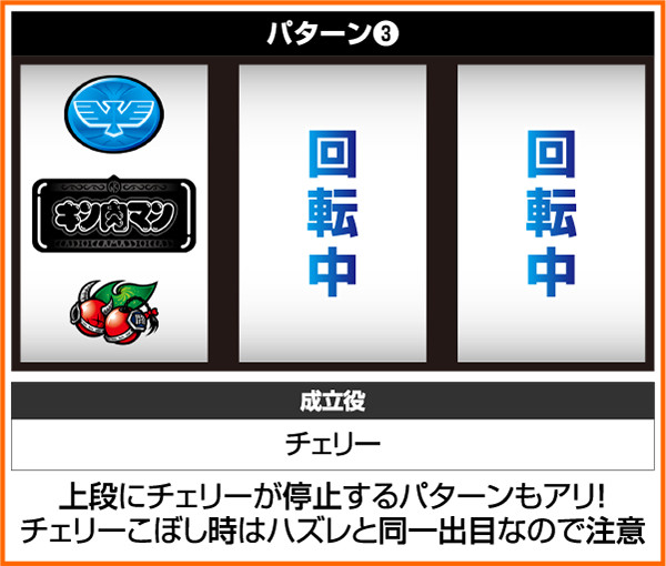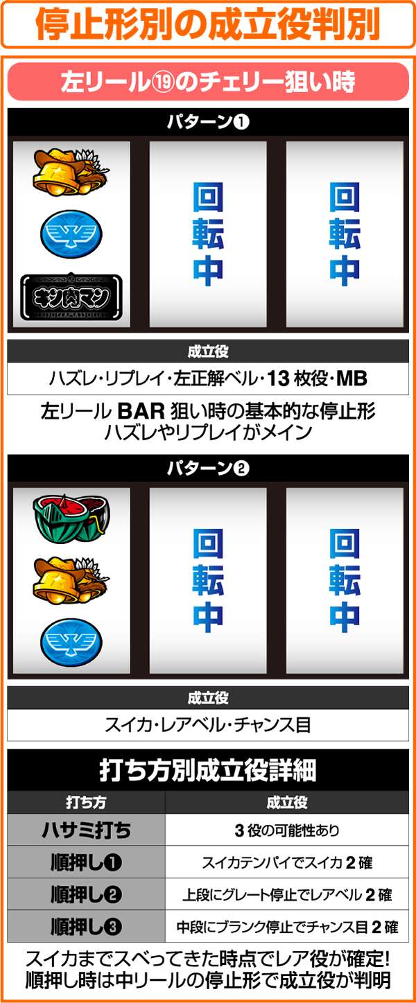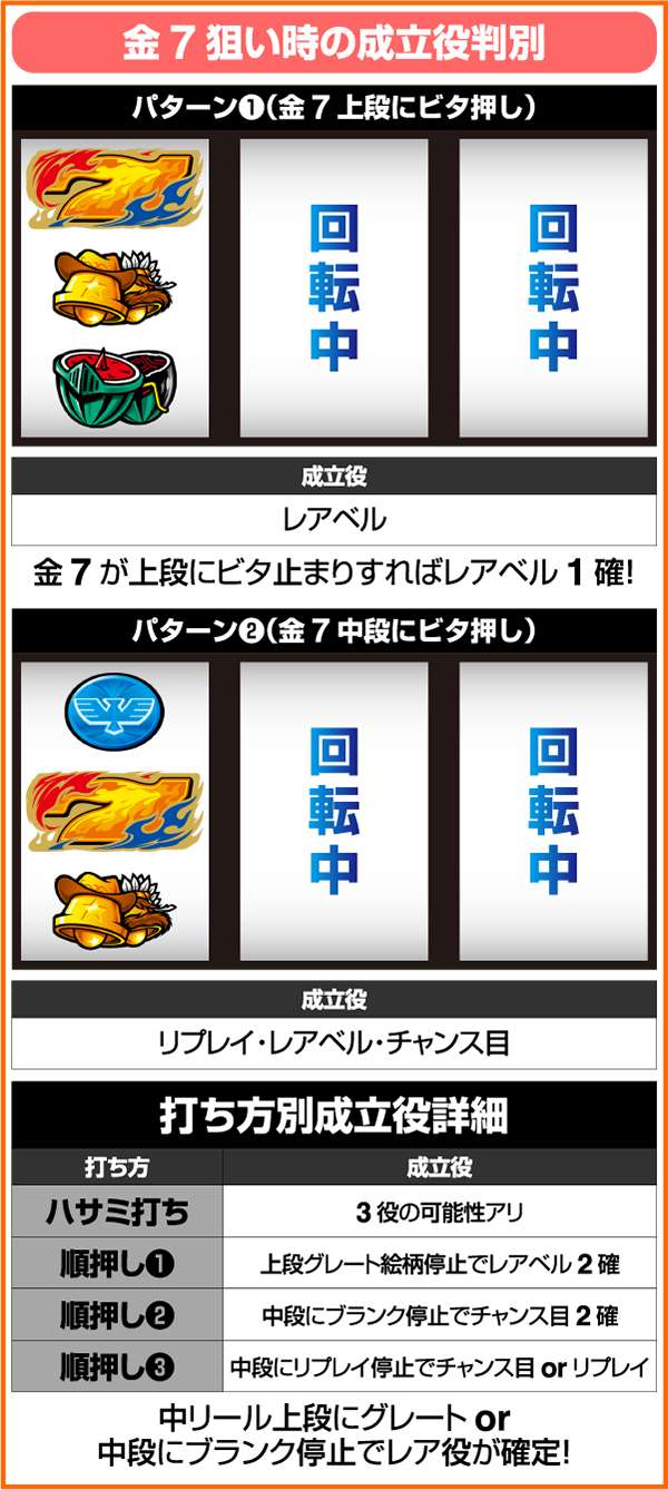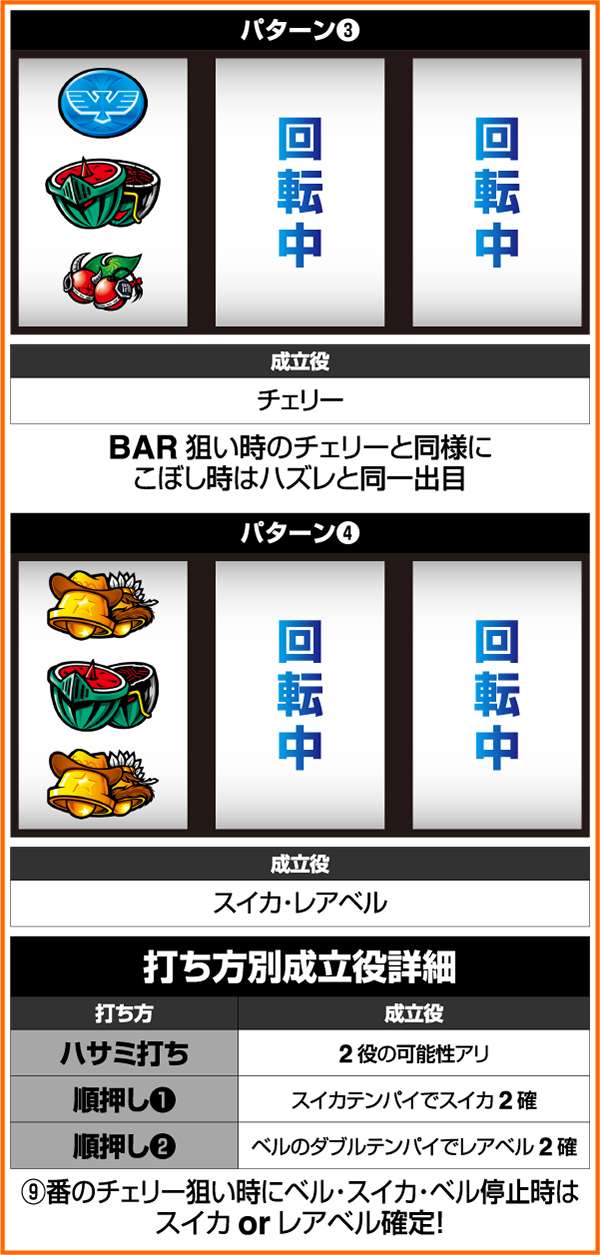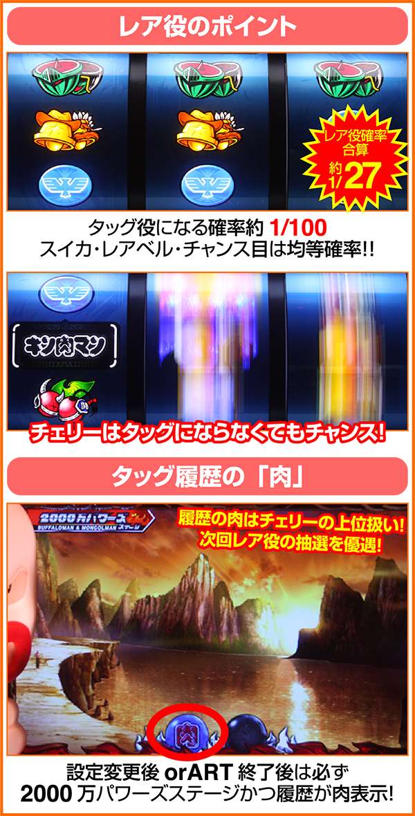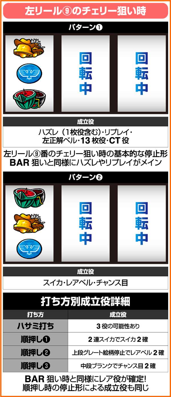 本機におけるレア役は前回の役と今回の役の組み合わせに応じて内部状態やCZ、ARTを抽選。レア役の組み合わせは、バラバラよりも同一の方がチャンスとなり、小役の種類ならチェリーがアツい。