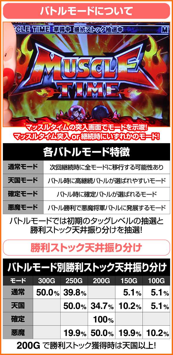 また、モードはマッスルタイムのハマリゲーム数による勝利ストック獲得の天井ゲーム数も決めている。