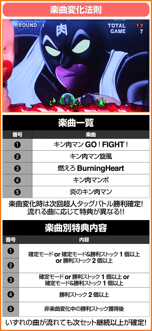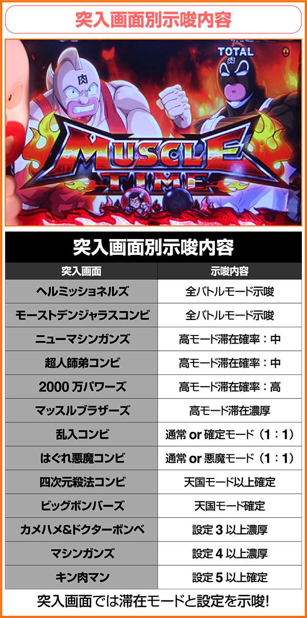 マッスルタイム中に任意での楽曲変化をおこなっていないのに楽曲変化が発生すれば次セット継続以上が確定。状況によってはモードが判別できる可能性もあるため、楽曲変化時は流れる曲にも注目しよう。