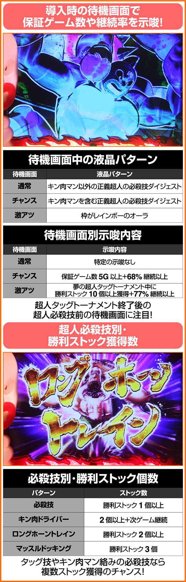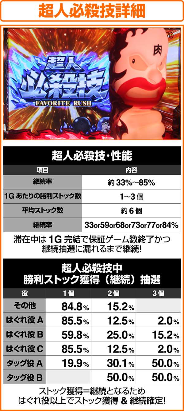 超人必殺技は1Gで完結しキン肉マン役モノが可動すれば継続する。滞在中は継続率で毎ゲーム継続抽選をおこない、継続抽選に漏れた場合は、保証ゲーム数を消化する。そのため、超人必殺技が継続する限り、勝利ストックを獲得し続けるので、ARTがロング継続する大チャンスとなる。