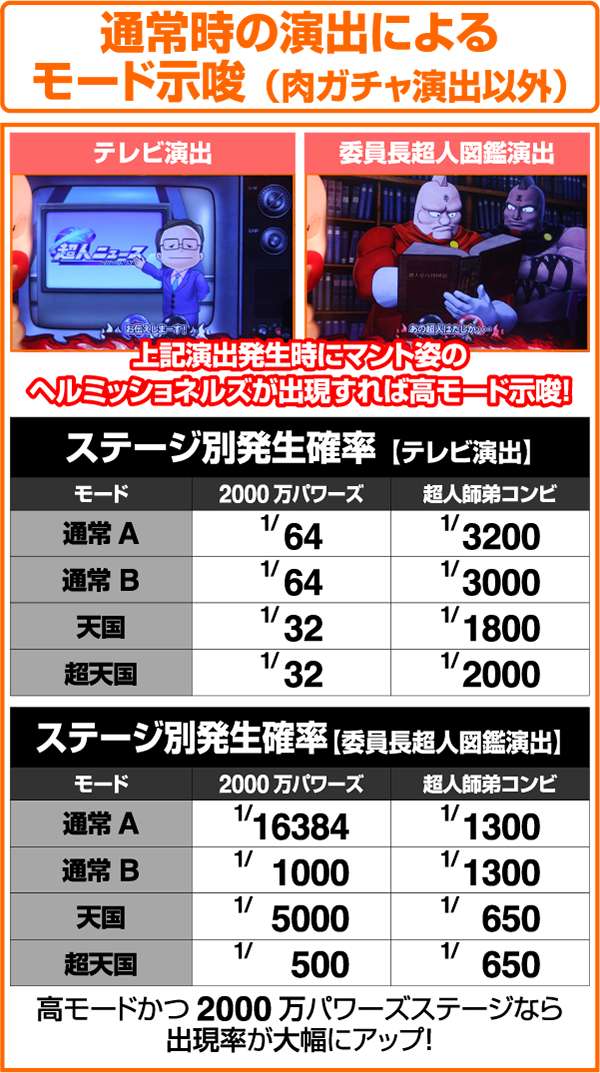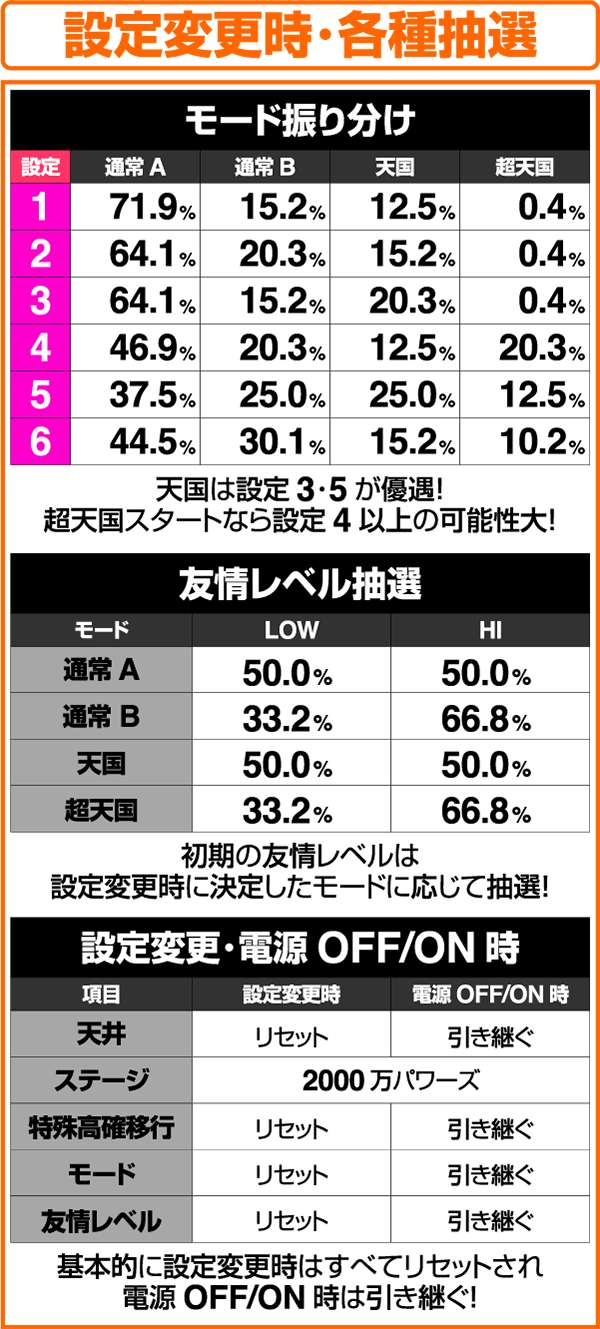また、2000万パワーズステージは示唆演出の出現率が他のステージに比べて大幅にアップしている。さ演出の発生確率は前兆状態によっても変化するため、上表の確率は全状態の平均値。