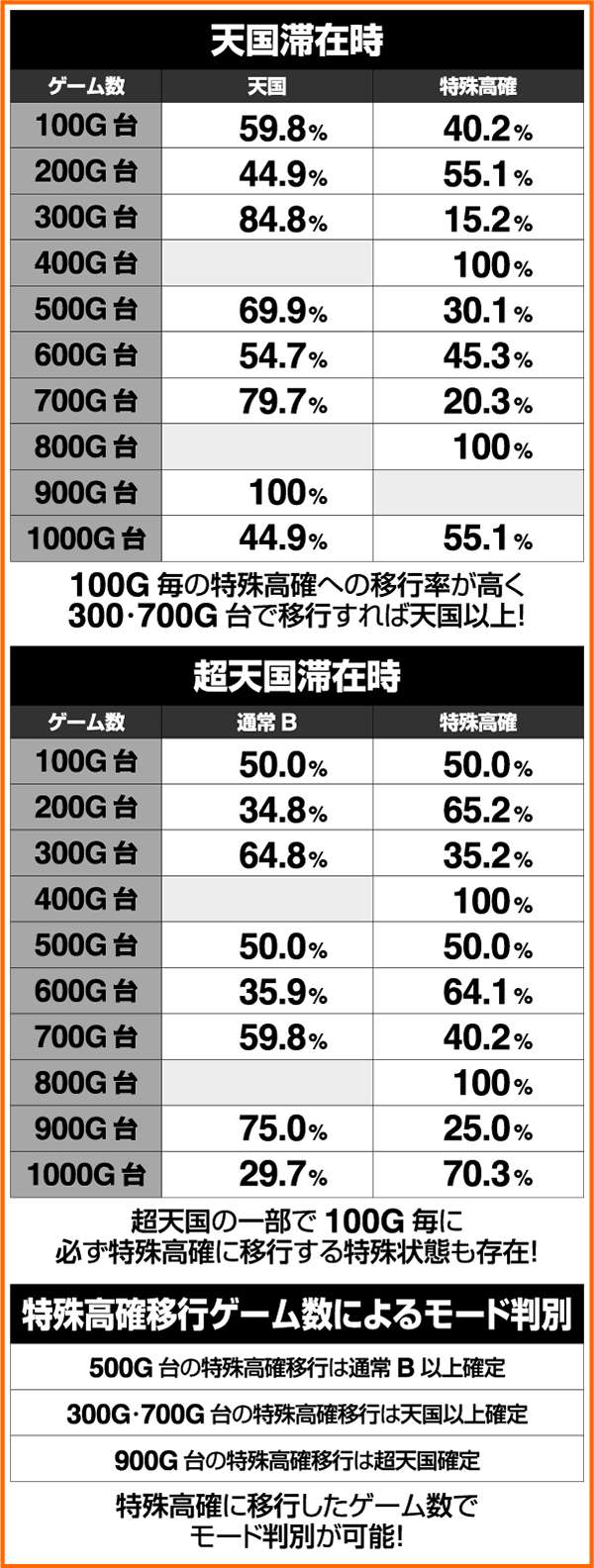 特殊高確はモードとゲーム数に応じて移行率が異なる。そのため、特定のゲーム数で特殊高確に移行すればモード判別が可能となる。
