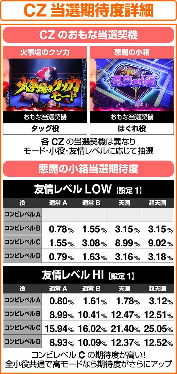 CZは、はぐれ役とタッグ役がメインの当選契機となっている。さらに、友情レベルやモードが上位になるほど当選期待度はアップする。