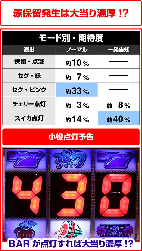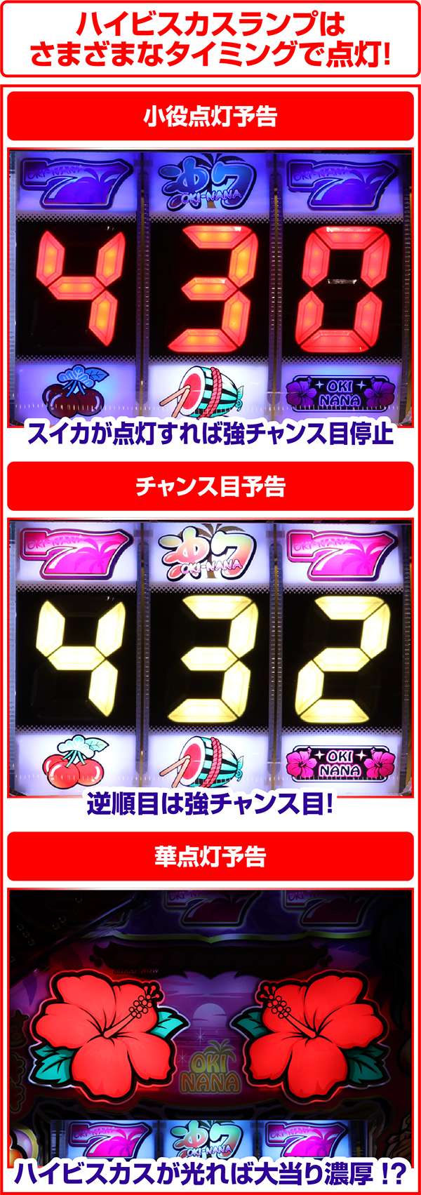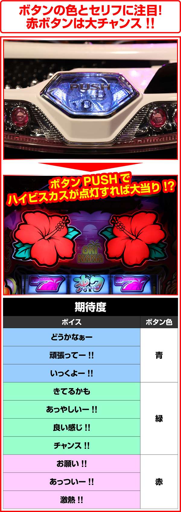 リーチ中はボタンを連打すると、ハイビスカスが点灯することがある。大当りをイチ早く察知したときは試してみよう。