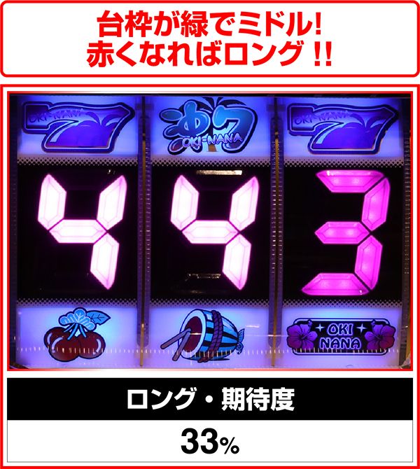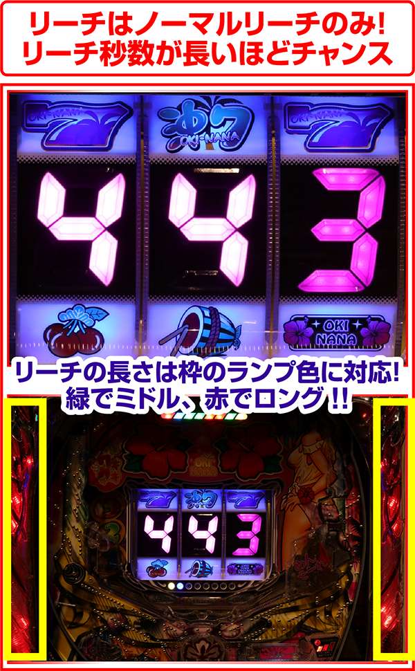 リーチの変動秒数が長くなるほどアツく、ショート→ミドル→ロングと変化していく。ロングを超えて超ロング(台枠レインボー)となれば大当り濃厚!?