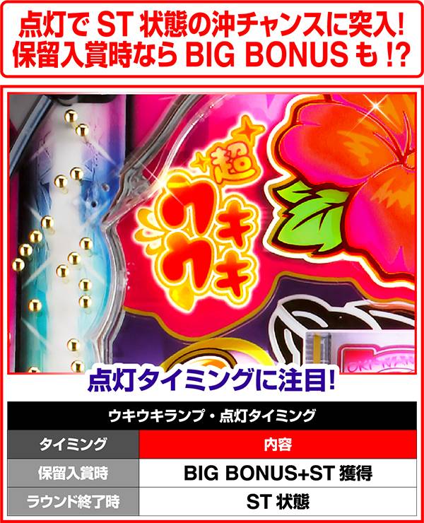 ハイビスカスが光れば大当りとシンプルなゲーム性が魅力。 大当り確率は約1/197、大当り後は必ず32回転の電サポが付き、 確変は突入率80%で36回転限定のSTとなる。電サポは32回転で終了してしまい、残り4回転は潜伏するので即ヤメは厳禁。 電サポ32回転は大当りと確変への期待感があわさりドキドキ感は2倍! アツい瞬間をギュッと濃縮した32回転を堪能しよう! |