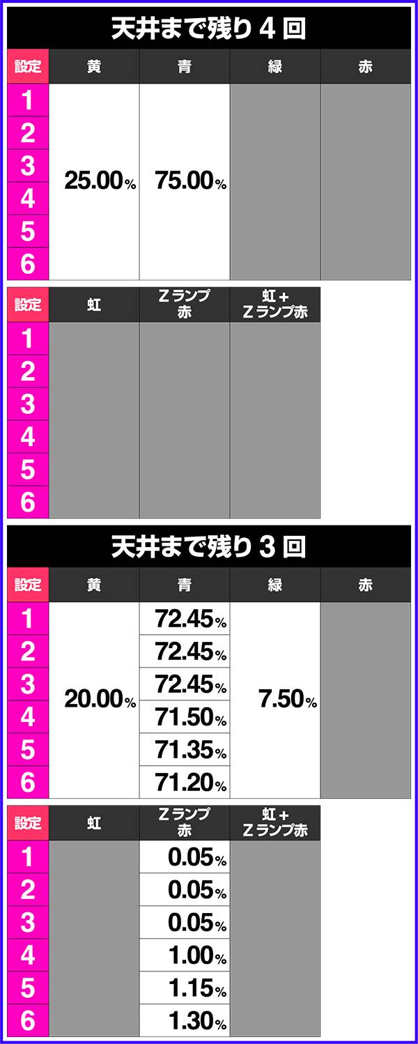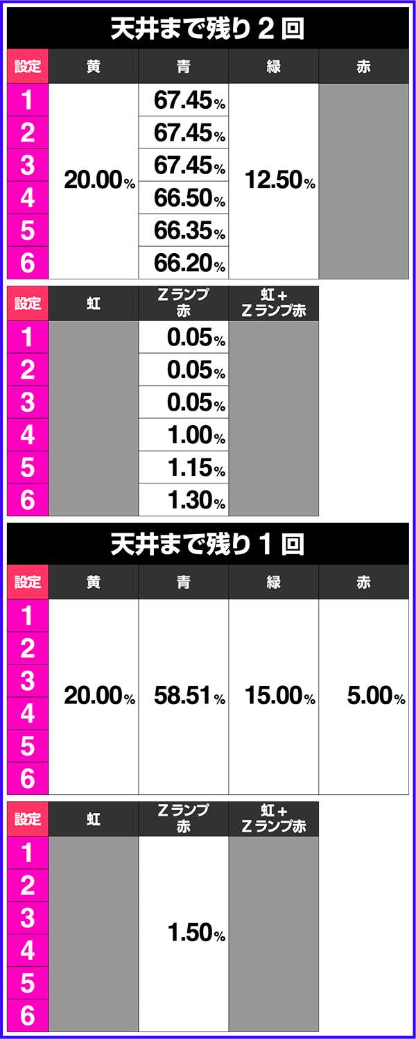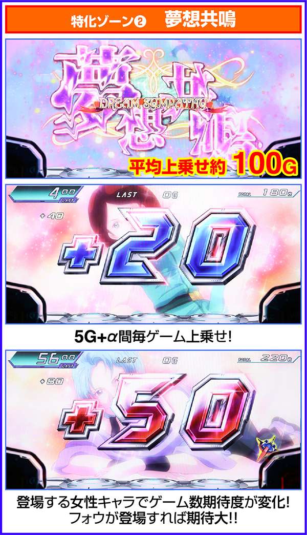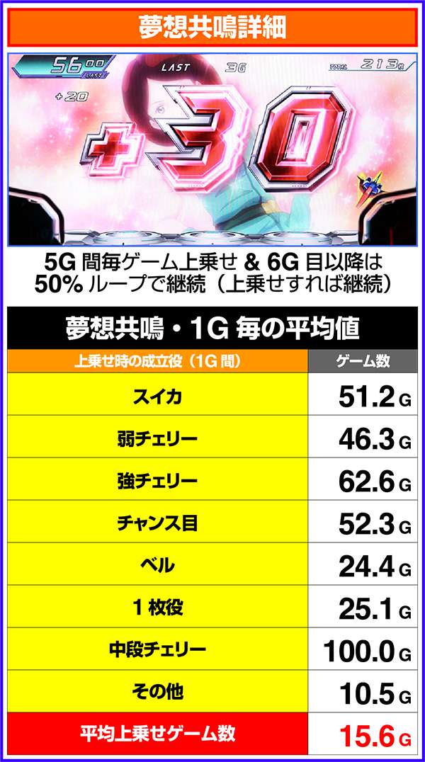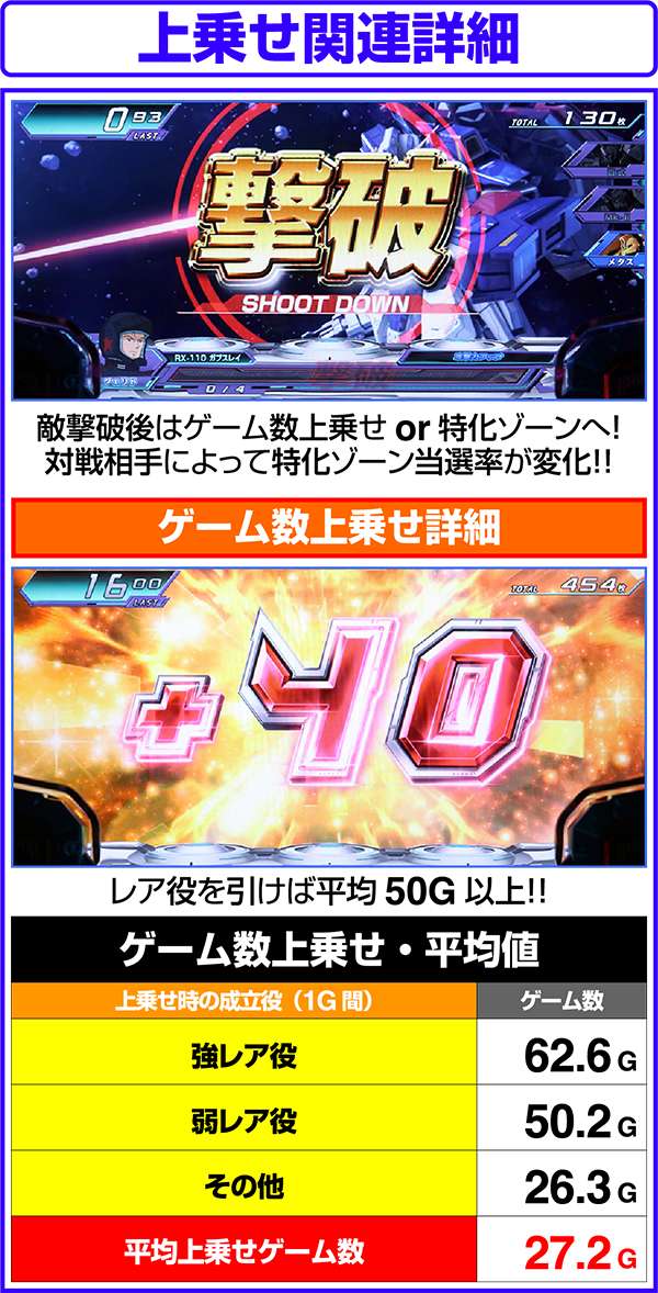 ゲーム数上乗せは1G完結だが、その他の特化ゾーンは保証ゲーム数消化後も50%で継続するため引き次第では超大量上乗せに期待できる。
