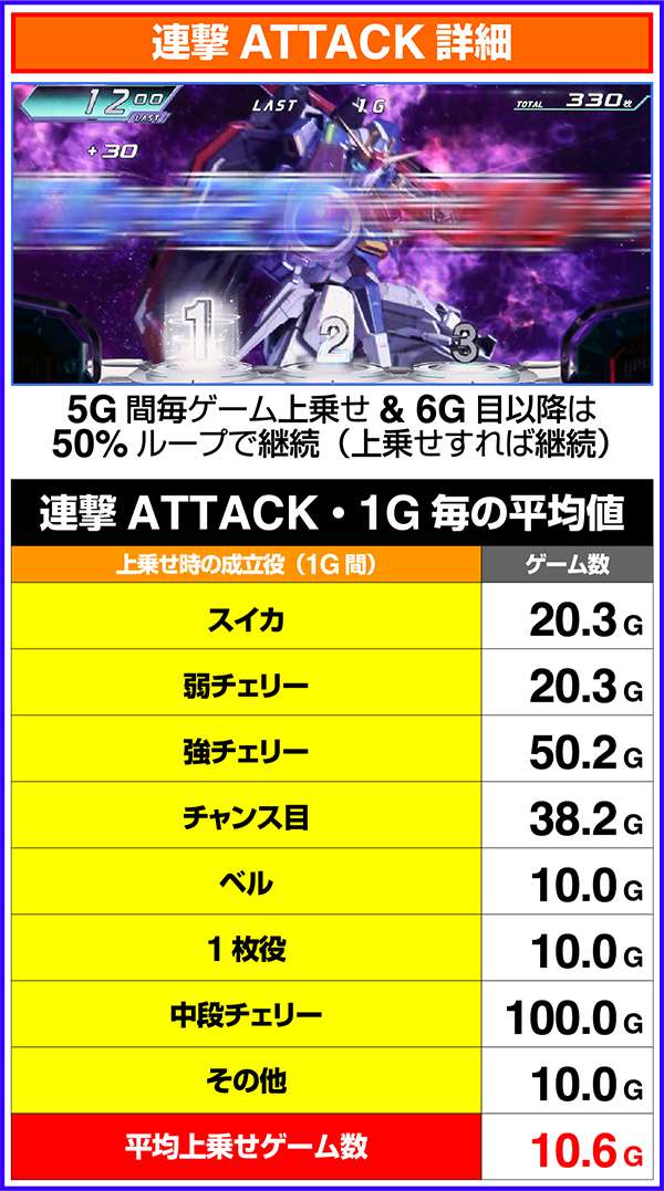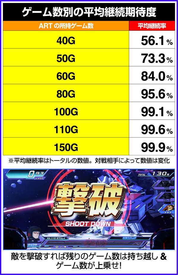 基本的にARTの所持ゲーム数が多いほど、敵にダメージを与える回数が多いため、結果的に勝利期待度もアップ。