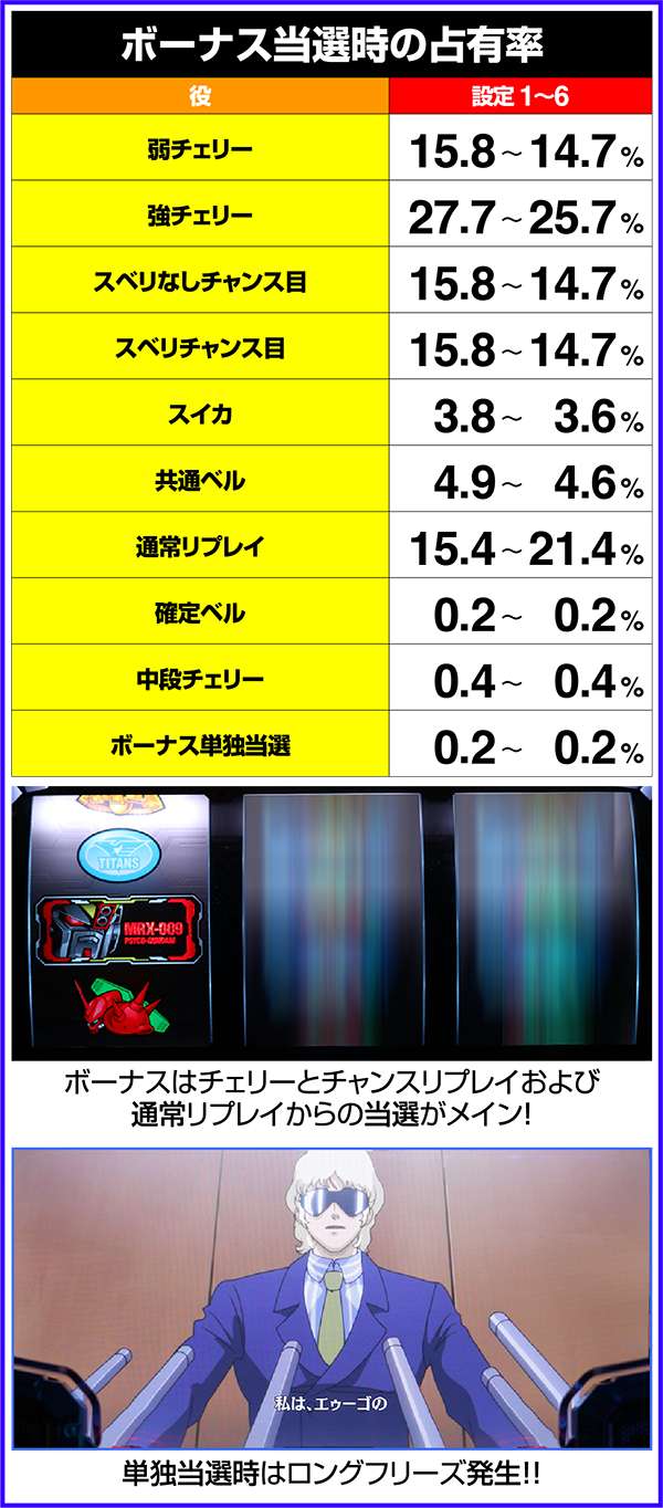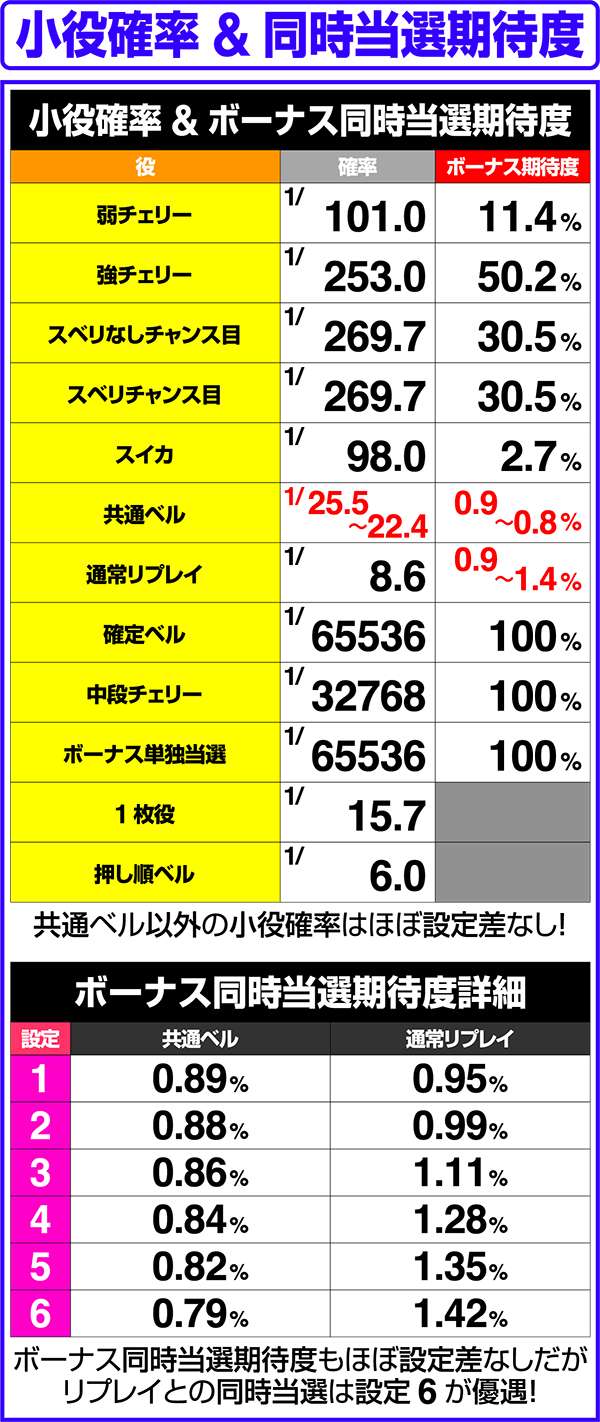 基本的に小役関連の設定差は小さいが、通常リプレイ時のボーナス実質確率は設定1で910.2分の1、設定6で1/606.8とそこそこの差がある。