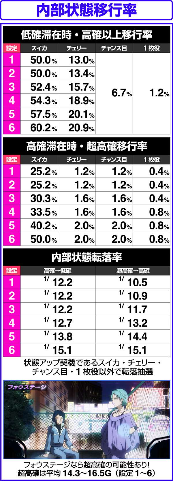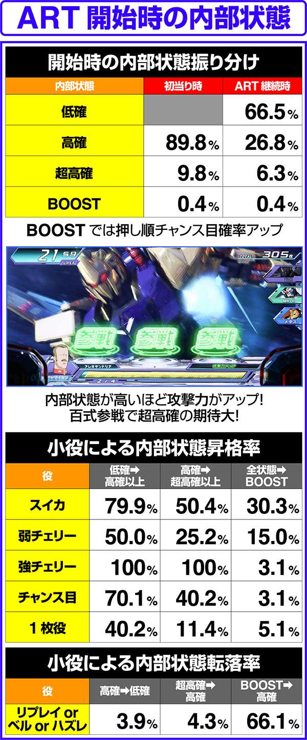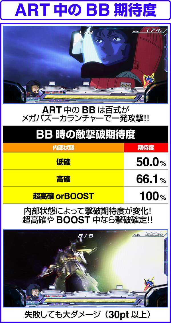 また、BB当選時の一撃撃破期待度も内部状態によって変化し、超高確中やBOOST中なら撃破確定となる。