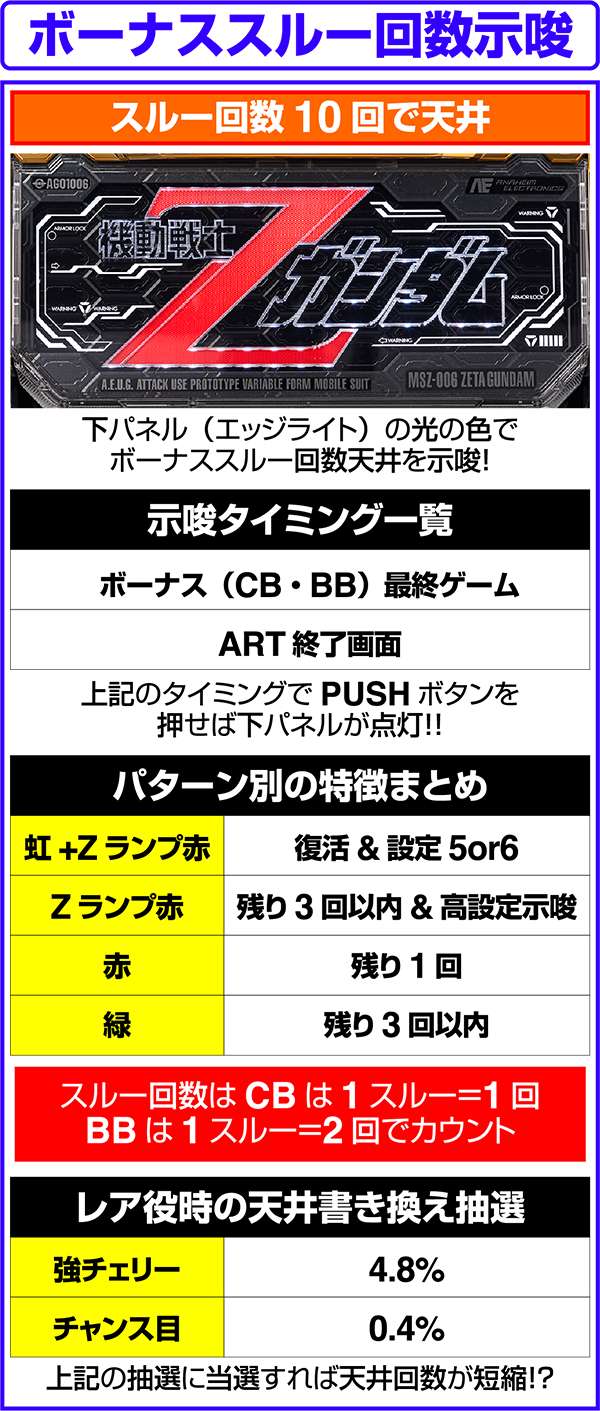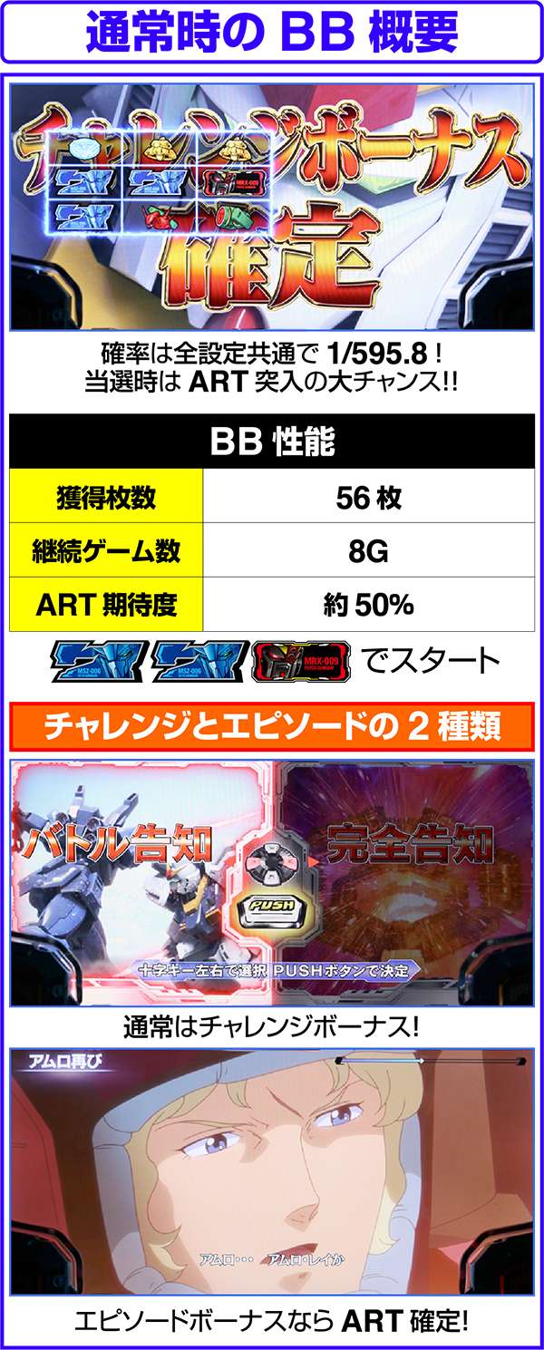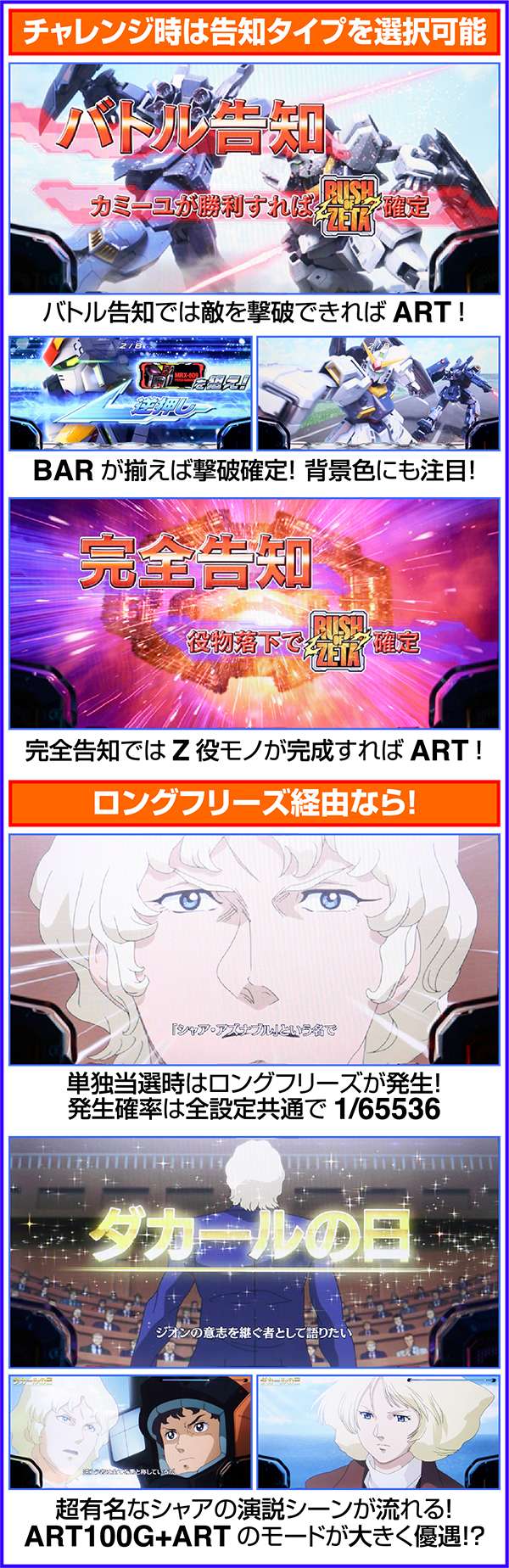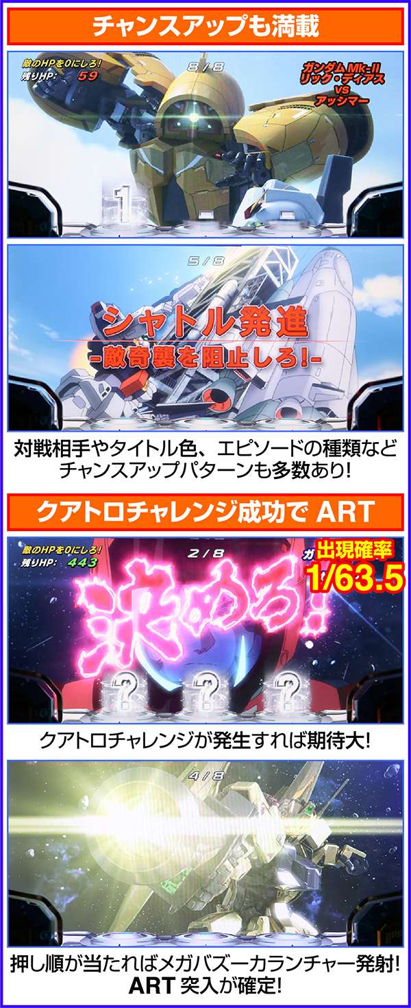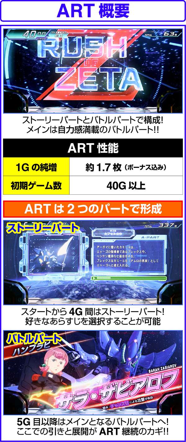 ボーナス+ARTタイプとして「パチスロ 機動戦士Ζガンダム」が登場。 通常時は基本的にBBorCBという2種類のボーナスからARTに突入させるゲーム性となっている。 ART「RUSH OF ZETA」は1Gあたりの純増約1.7枚(ボーナス込み)、1セット40G以上。 メインとなるバトルパートでは毎ゲーム全役で敵へのダメージ抽選がおこなわれ、勝利した時点でART継続が確定する。 |