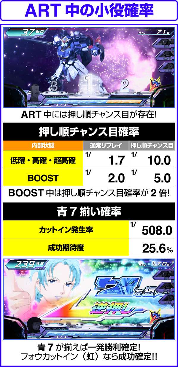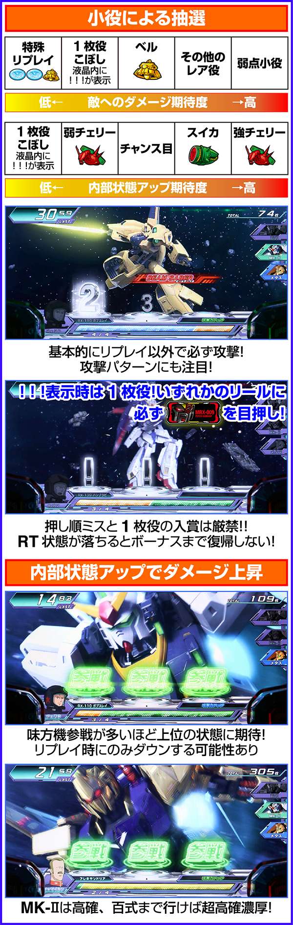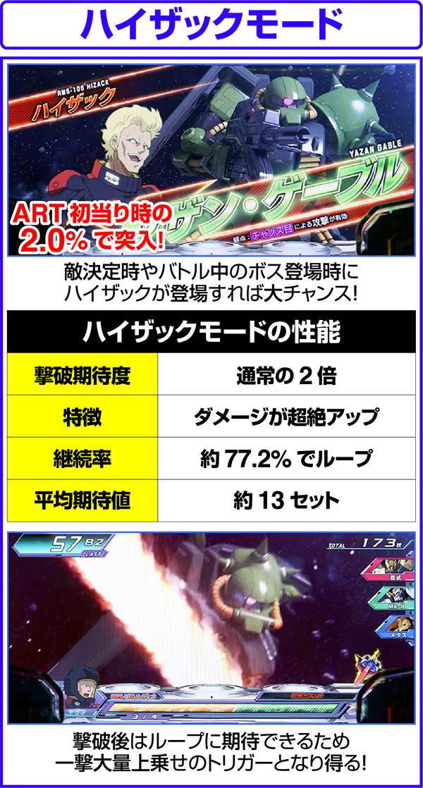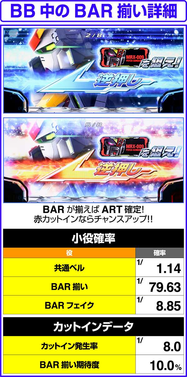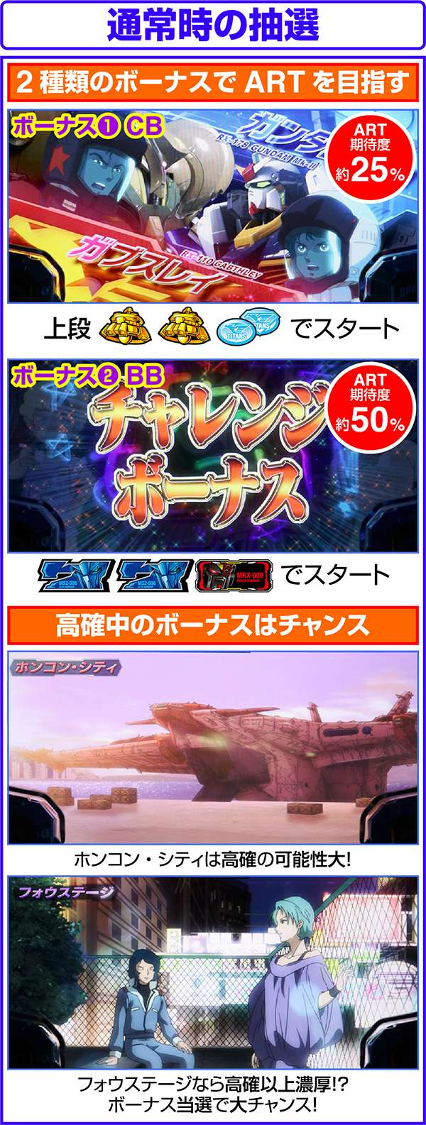 ボーナス+ARTタイプとして「パチスロ 機動戦士Ζガンダム」が登場。 通常時は基本的にBBorCBという2種類のボーナスからARTに突入させるゲーム性となっている。 ART「RUSH OF ZETA」は1Gあたりの純増約1.7枚(ボーナス込み)、1セット40G以上。 メインとなるバトルパートでは毎ゲーム全役で敵へのダメージ抽選がおこなわれ、勝利した時点でART継続が確定する。 |