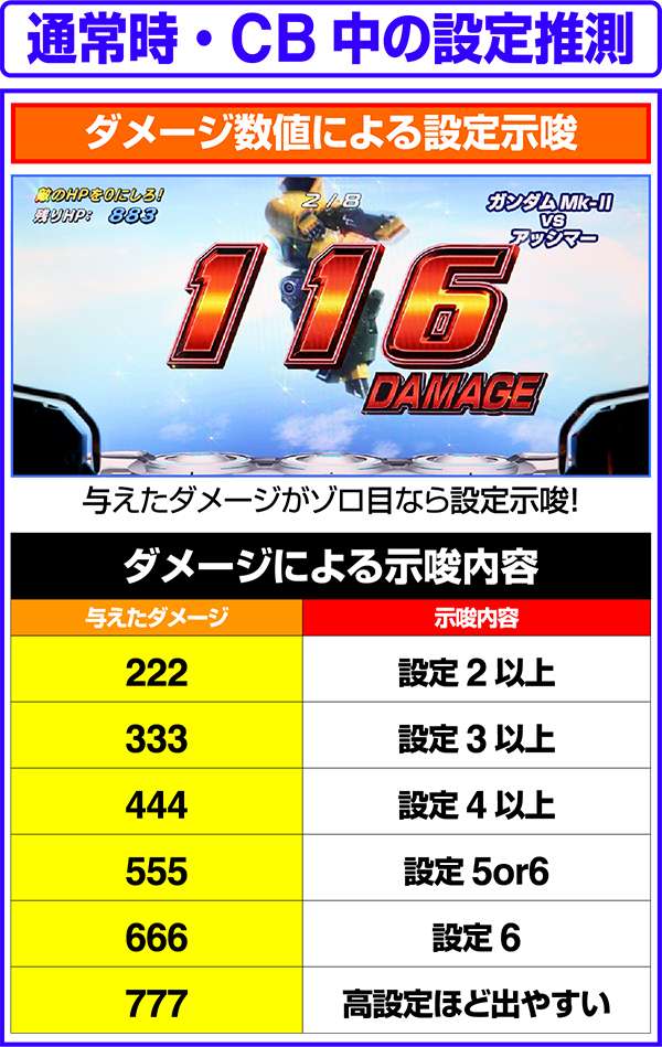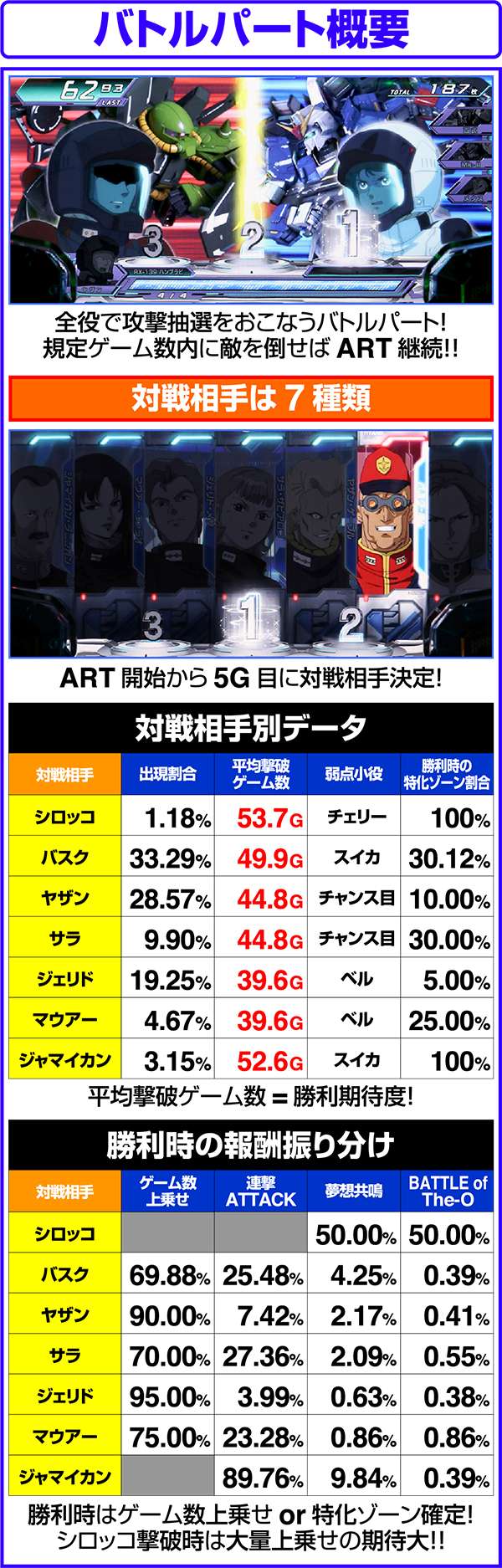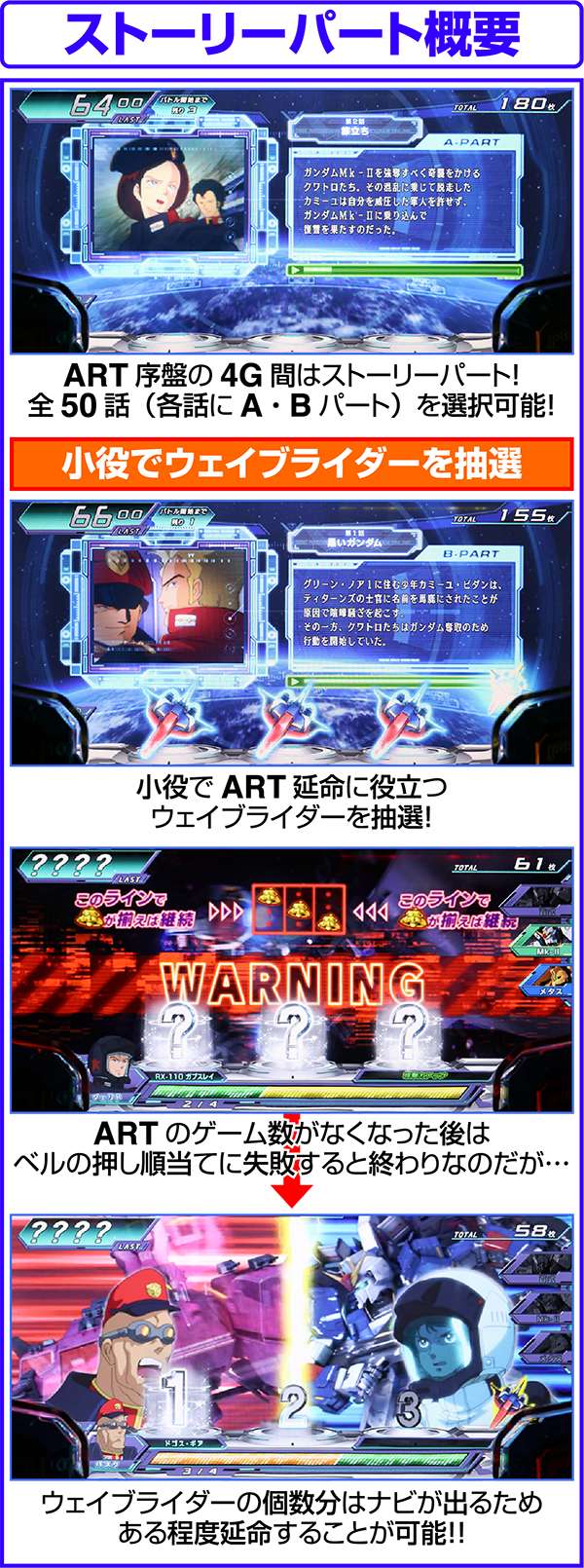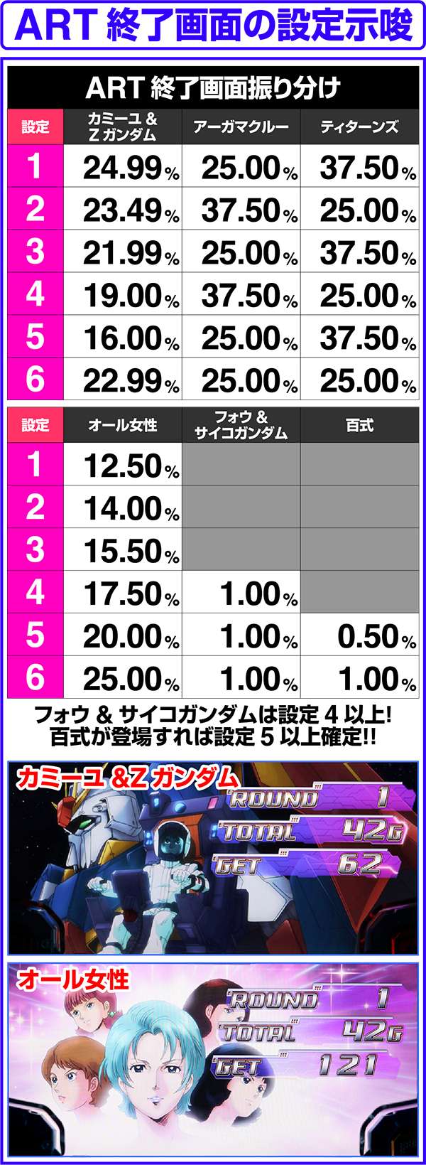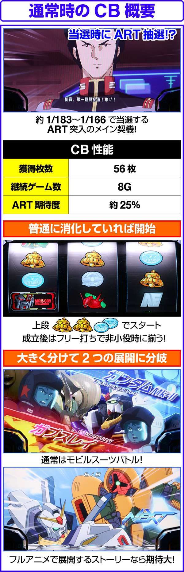 ボーナス+ARTタイプとして「パチスロ 機動戦士Ζガンダム」が登場。 通常時は基本的にBBorCBという2種類のボーナスからARTに突入させるゲーム性となっている。 ART「RUSH OF ZETA」は1Gあたりの純増約1.7枚(ボーナス込み)、1セット40G以上。 メインとなるバトルパートでは毎ゲーム全役で敵へのダメージ抽選がおこなわれ、勝利した時点でART継続が確定する。 |