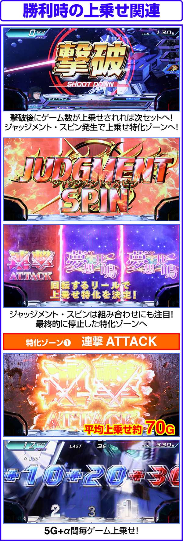 勝利した場合は残りのゲーム数を次回セットに持ち越し&上乗せ演出or特化ゾーンでゲーム数が上乗せされるため、早期に決着するほど連チャンに期待できるという仕組みだ。