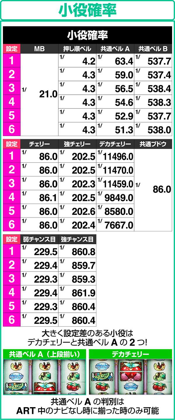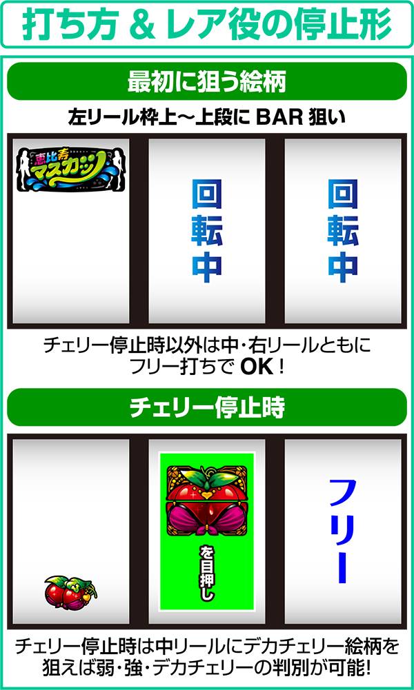 チェリー停止時は中リールにデカチェリー絵柄を目押しすることで、弱・強・デカチェリーの判別が可能。デカチェリー絵柄が非停止なら弱チェリー、中下段に停止なら強チェリー、上中段に停止すればデカチェリーとなる。