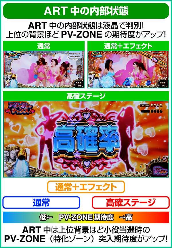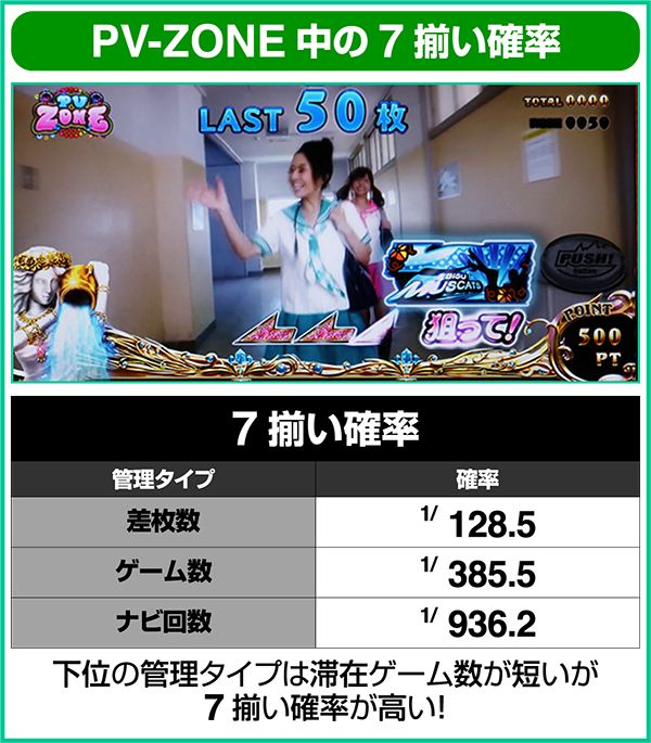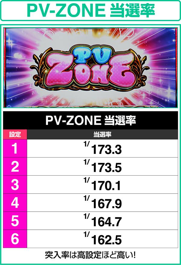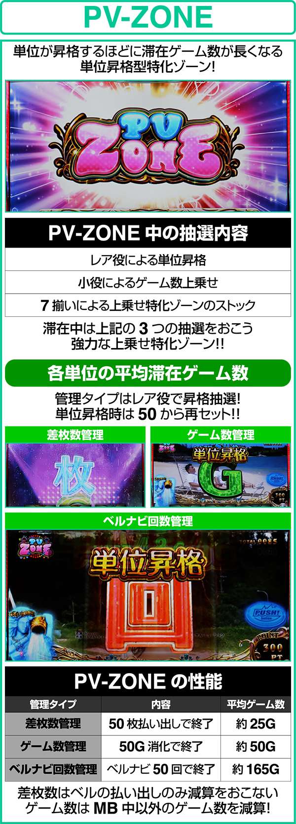 PV-ZONE突入時は差枚数管理からスタートし、レア役で単位昇格抽選やゲーム数上乗せをおこなう。レア役以外にも7揃いで特化ゾーンをストックするため、滞在中は単位を昇格させて、滞在ゲーム数を伸ばしつつ消化したい。