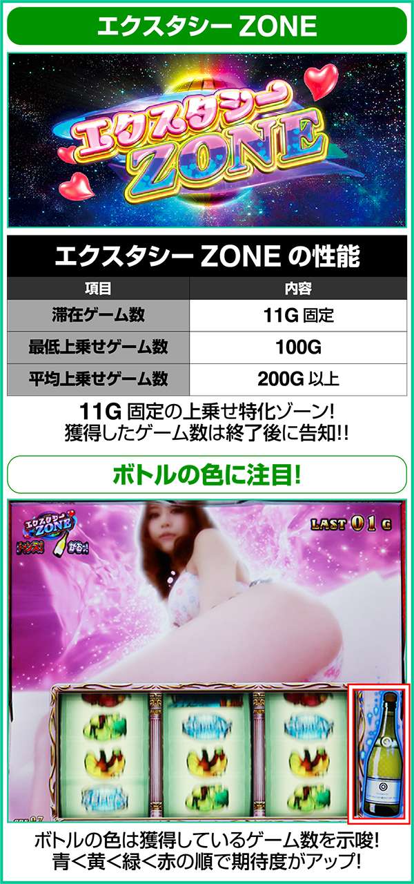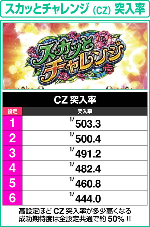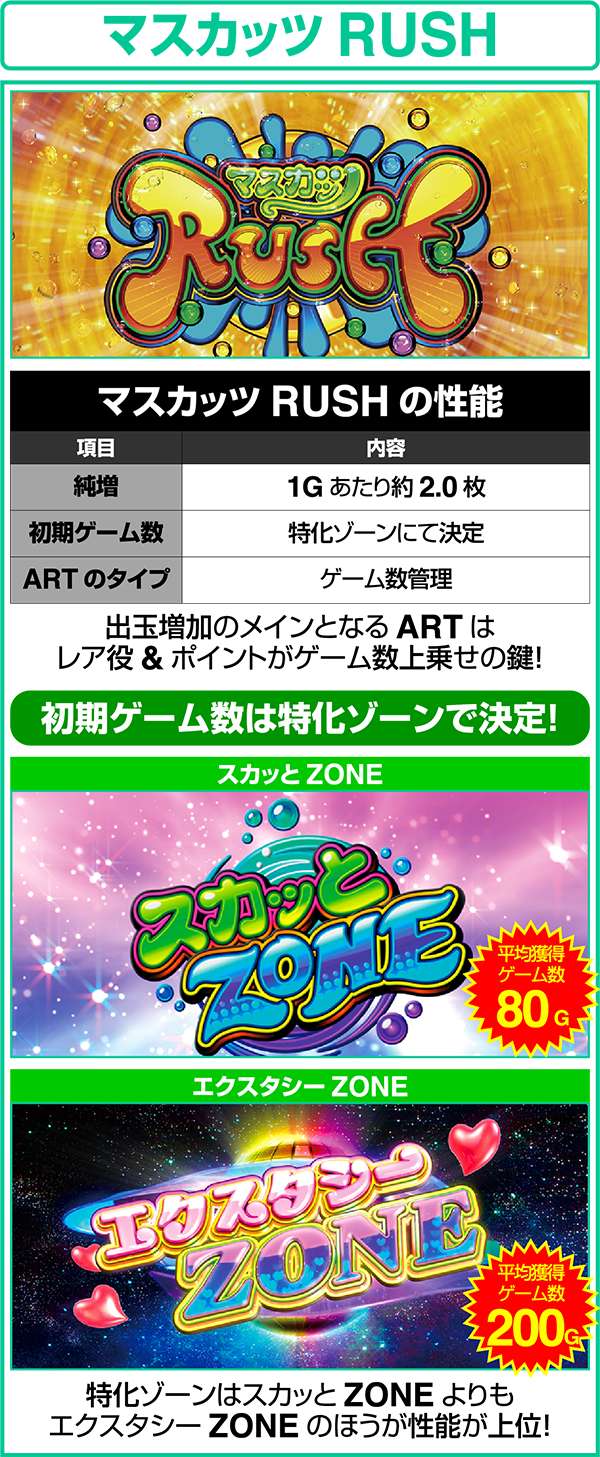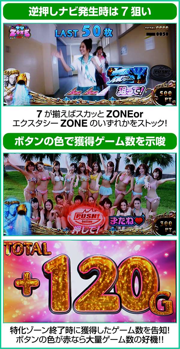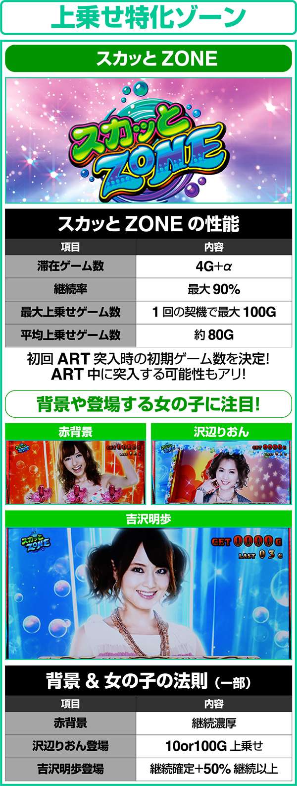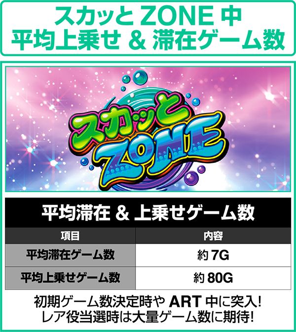スカッとZONEはおもに初期ゲーム数の決定時に発生。消化中は継続率に漏れるまで、毎ゲームARTのゲーム数を獲得できる。消化中のレア役当選時は、大量ゲーム数獲得のチャンス。