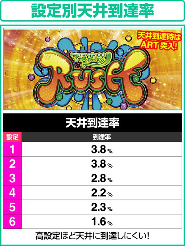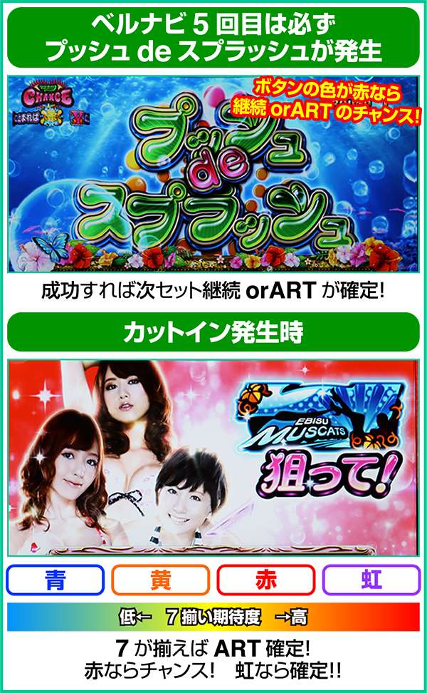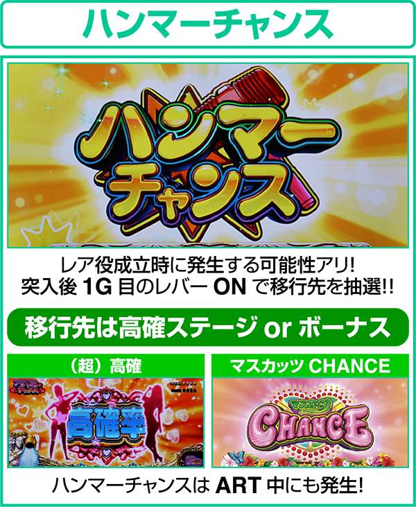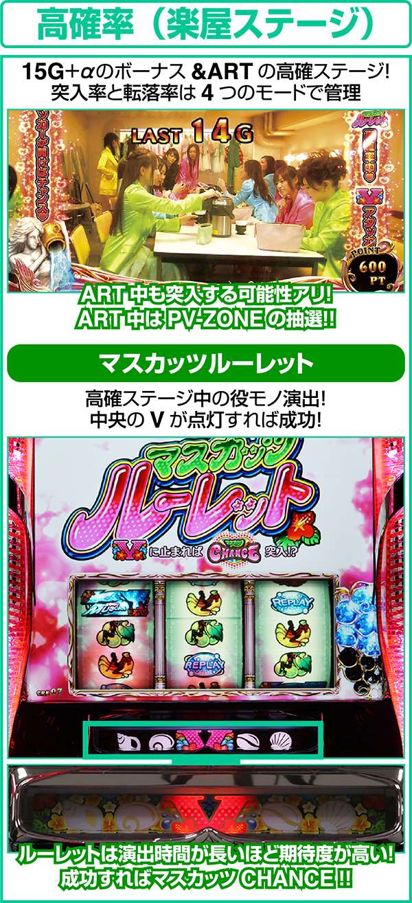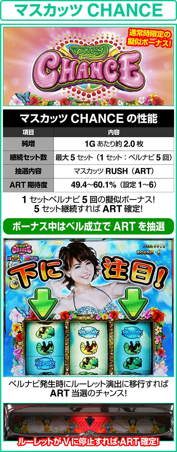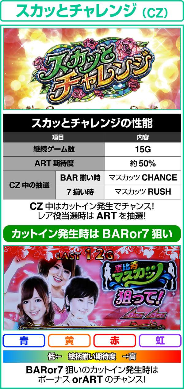 深夜の人気テレビ番組「恵比寿マスカッツ」がパチスロになって登場。 通常時のメインは全小役でptの獲得抽選をおこい、規定のpt到達でCZや擬似ボーナス、ARTなどに当選するチャンスといった流れだ。 ARTの「マスカッツRUSH」は1Gの純増約2.0枚でゲーム数管理。単位変化型上乗せ特化ゾーンである「PV-ZONE」、最胸の上乗せゾーン「エクスタシーZONE」など、大量出玉のトリガーも搭載している。 |