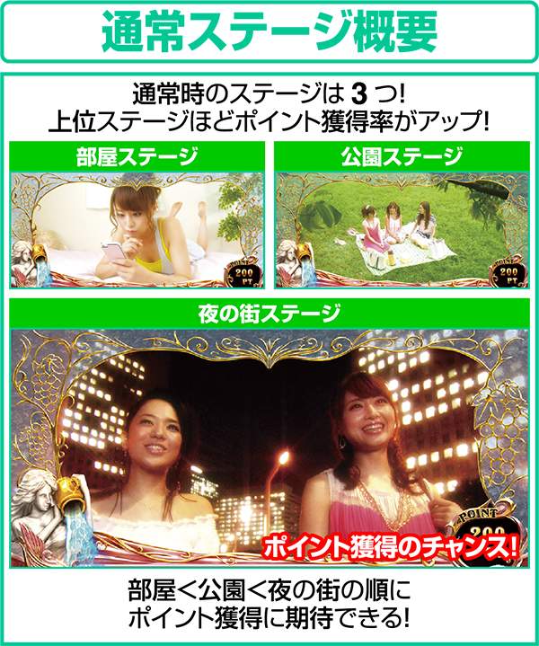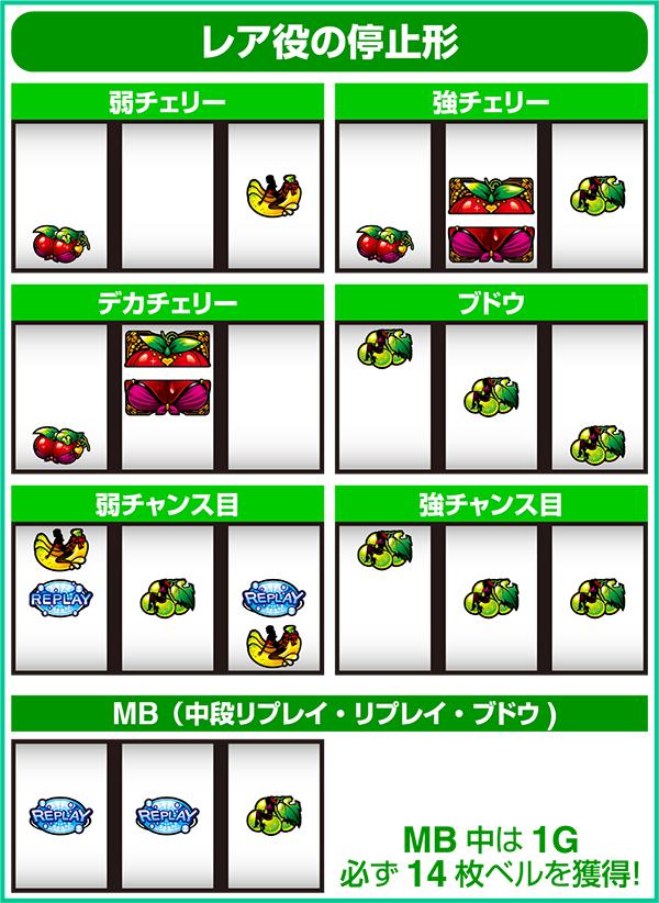 通常時はハズレを含む全役でポイント獲得抽選をおこなっており、ポイントの獲得率や量は上位ステージほど優遇。レア役当選時は高ポイント獲得のチャンスとなり、ブドウ当選時は3桁ポイントが確定。