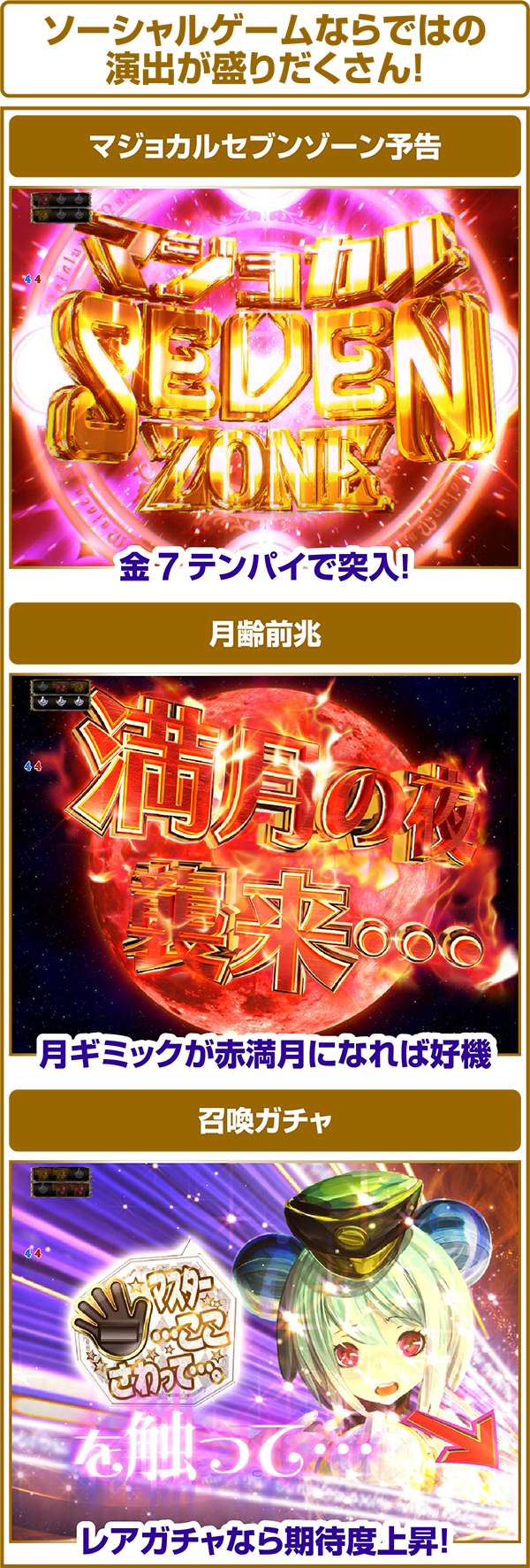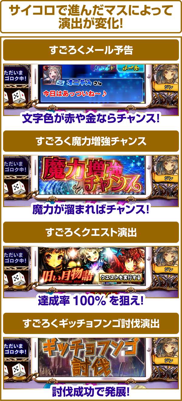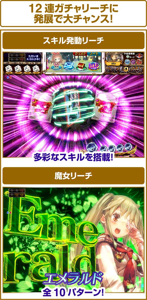 藤商事ソーシャルゲーム系パチンコのシリーズ第3弾! 大当り確率約1/99、ST突入率100%(継続率50.6%)、ヘソ賞球5個と遊びやすい仕様。 通常時は特図1と特図2が同時変動しており、特図2は盤面上部のすごろく液晶で展開する。すごろく液晶はサイコロで進んだマスで演出が発生、メイン液晶とすごろく液晶のダブルで楽しめる。 ガチャやカードバトル、スキルなど、ソシャゲならではといった演出も満載! |