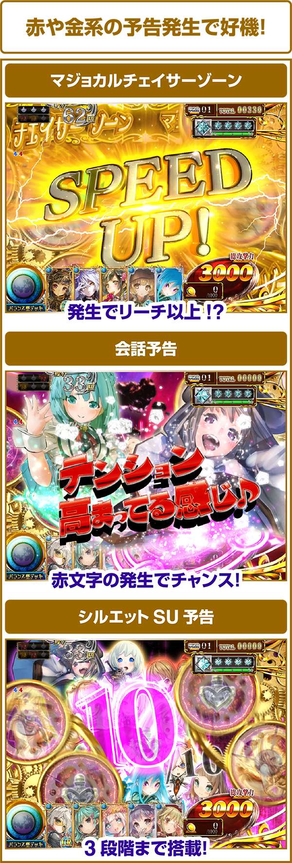 マジョカルチェイサーゾーンはスピードアップするほどアツく、緑→赤→金の順に背景が変化。