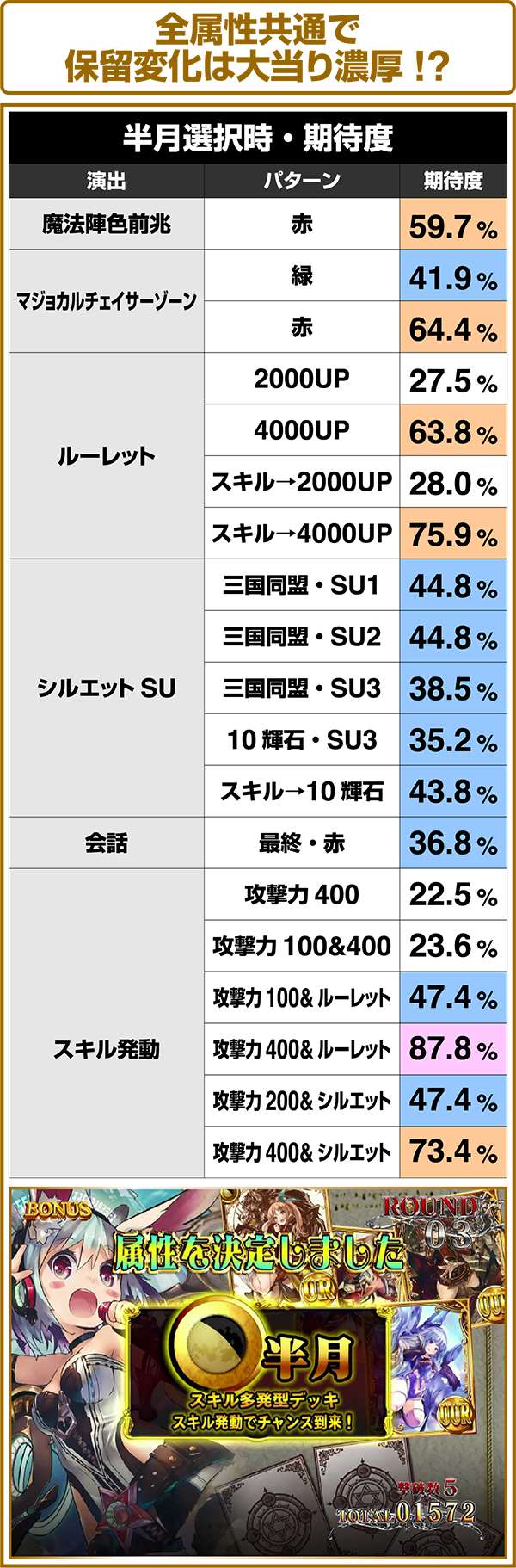 属性は大当り中に選択できる。属性による違いは主にスキル発動時の期待度に影響する。