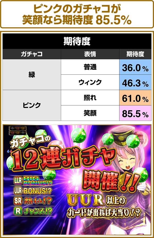 12連ガチャリーチはガチャコの髪色がピンク、表情が笑顔やデレのパターンならチャンス!?