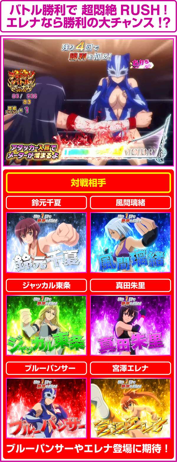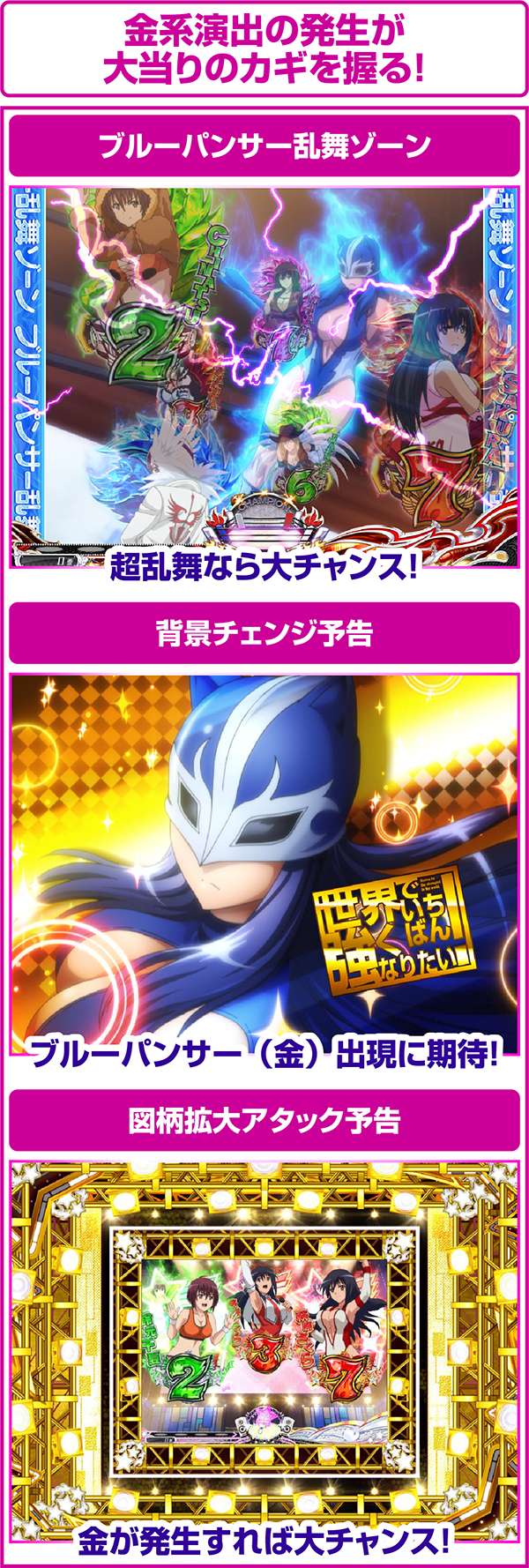 絶叫女子プロレスアニメがパチンコにリングイン! スペックはオーソドックスなミドルタイプで、次回大当りまで電サポが継続する確変と、通常大当り後に時短100回転を搭載。 アツさとかわいさが同居した液晶演出や人気声優の起用など、ファンには堪らない1台だ。 |