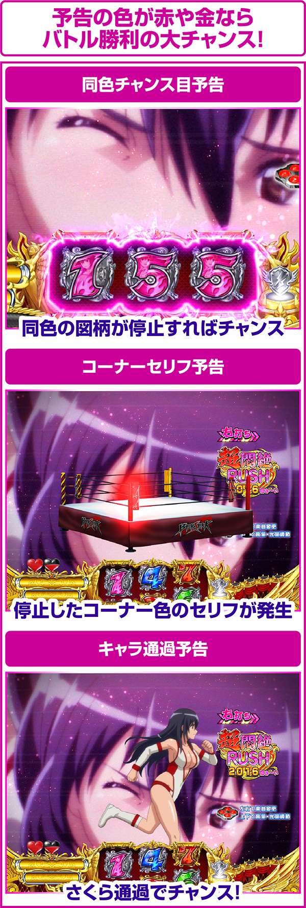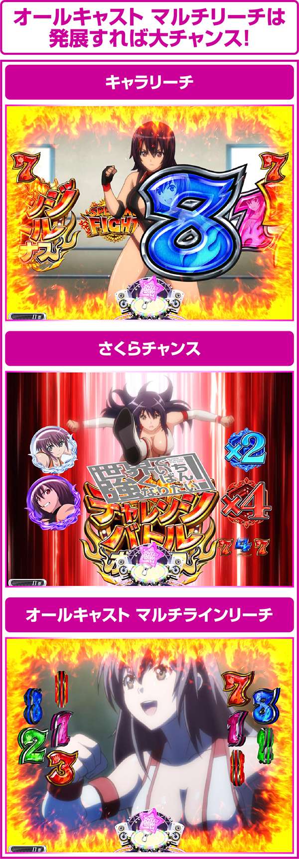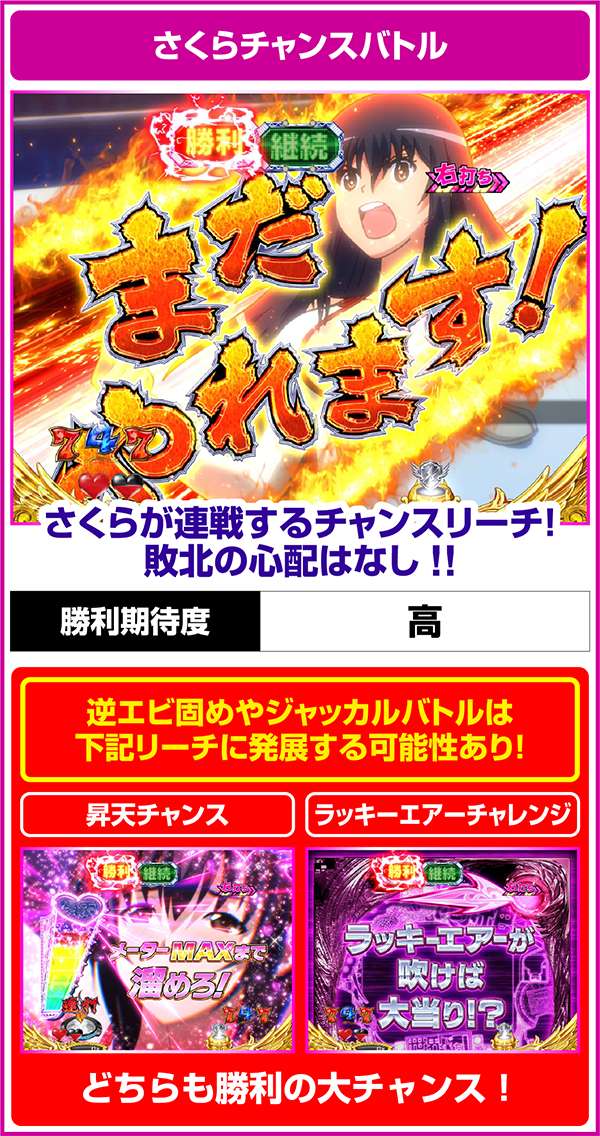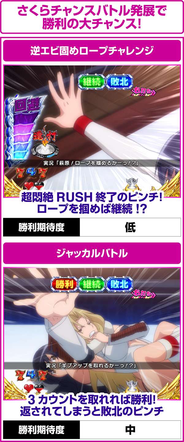 キャラリーチとさくらチャンスはチャレンジバトルボーナス図柄やSpecial Fight図柄停止に期待したい。チャレンジバトルボーナス図柄停止で大当りとなり、ラウンド中バトルに勝利すれば確変獲得となる。