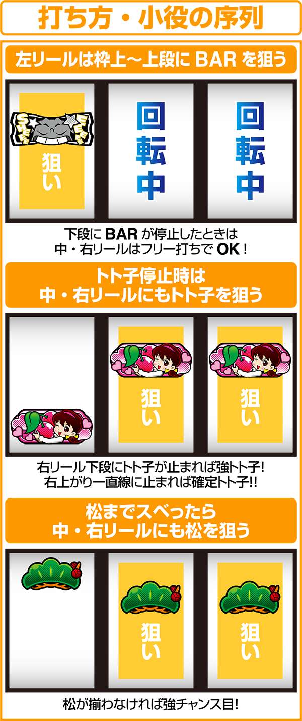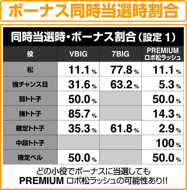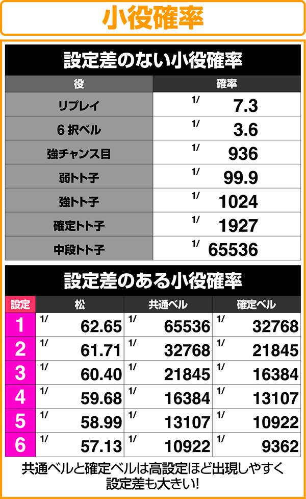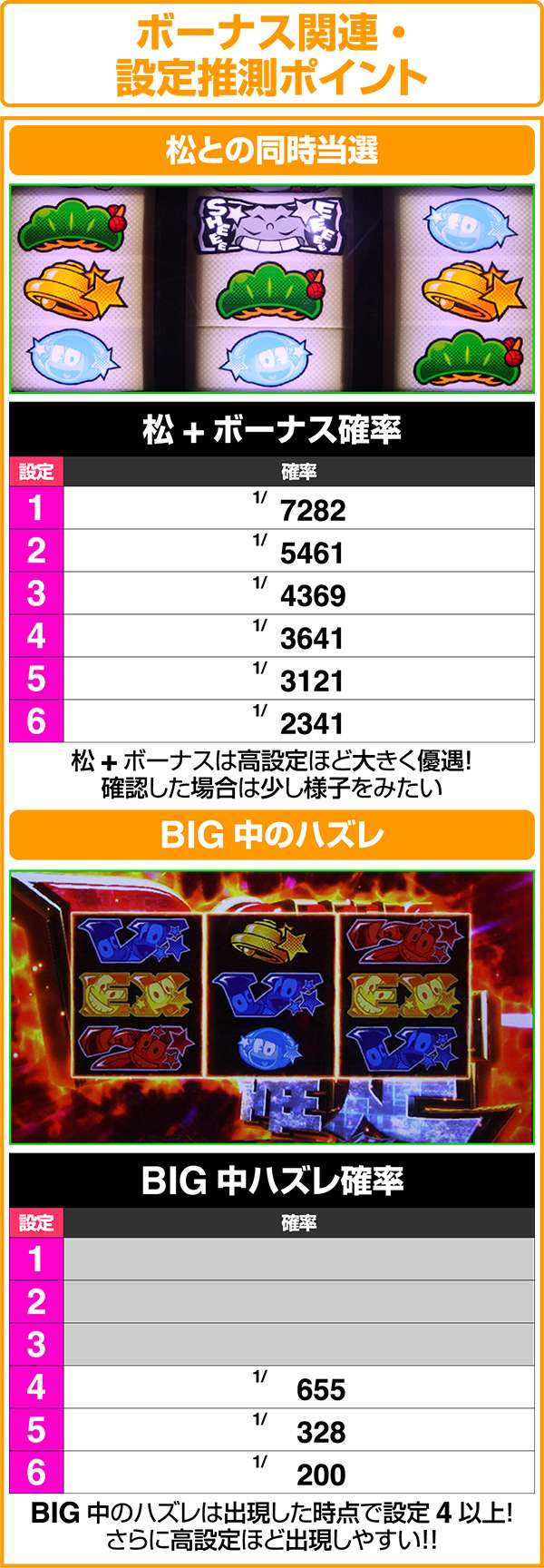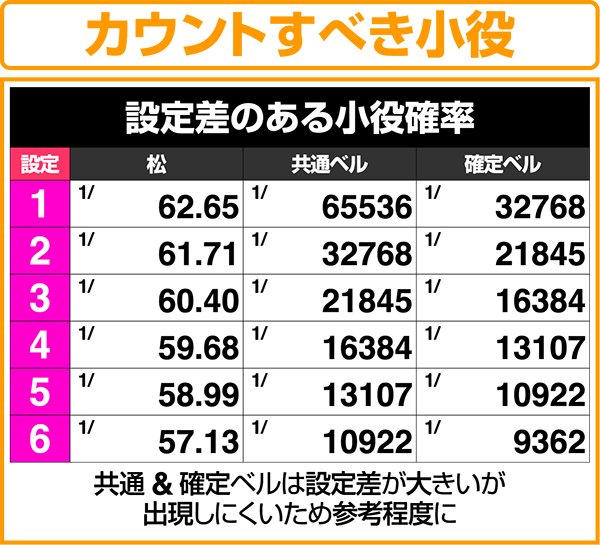 松とボーナスの同時当選は約0.9%〜約2.4%(設定1〜6)と、2.6倍ほどの差があることも合わせて覚えておこう。