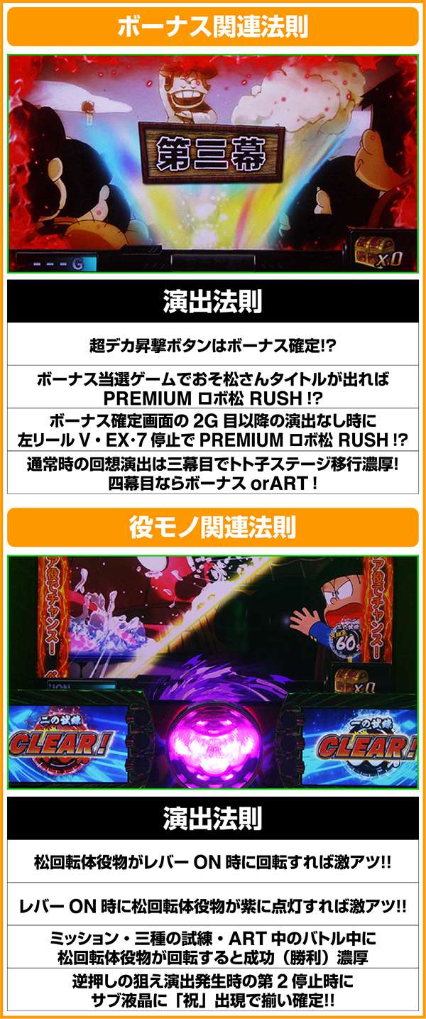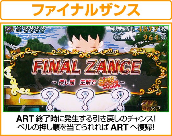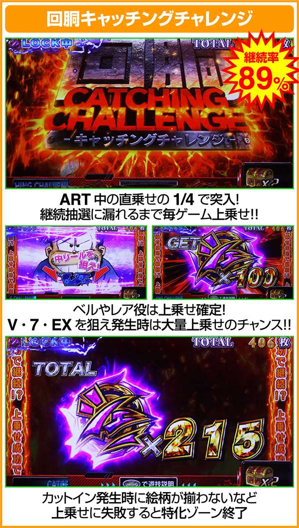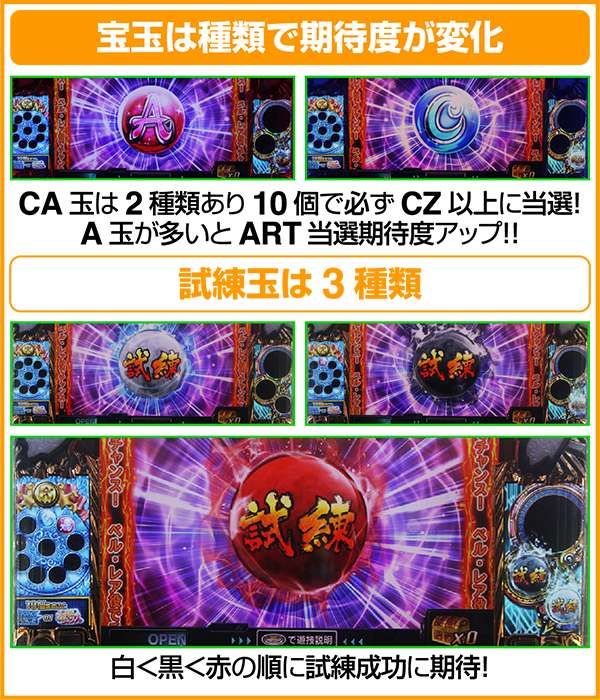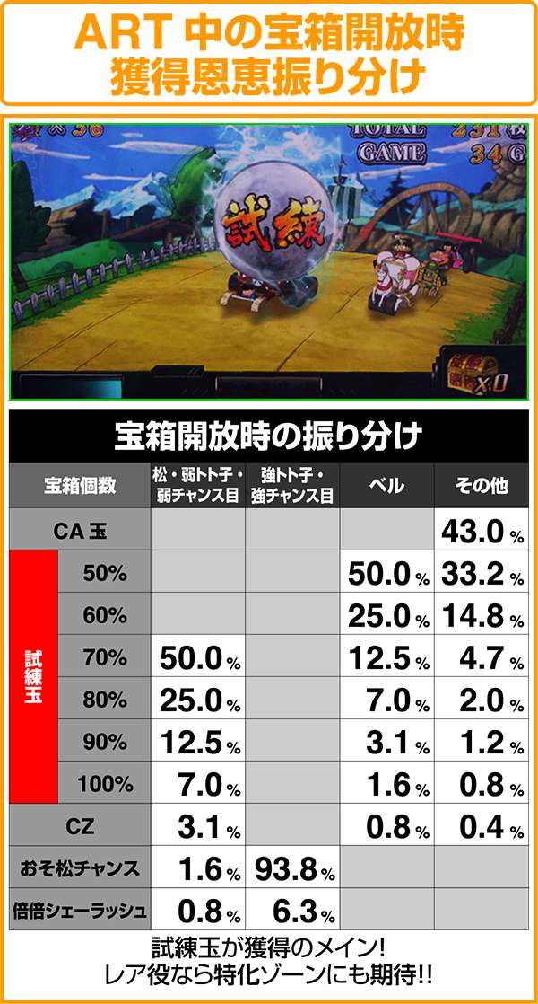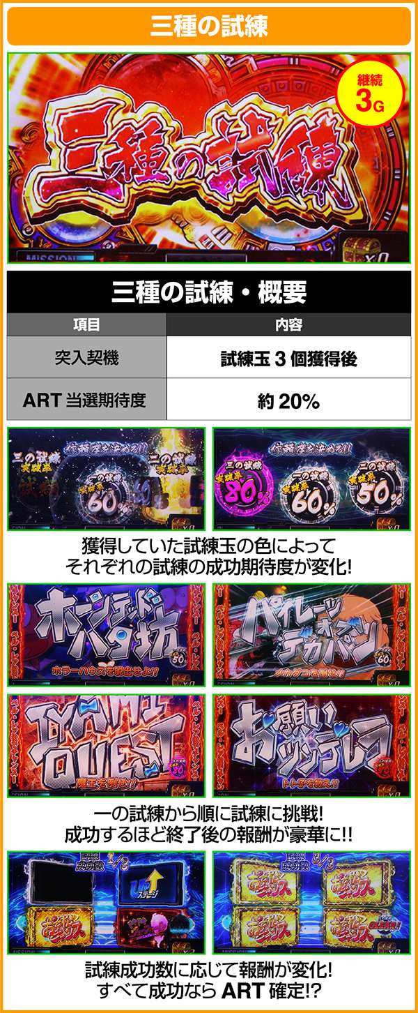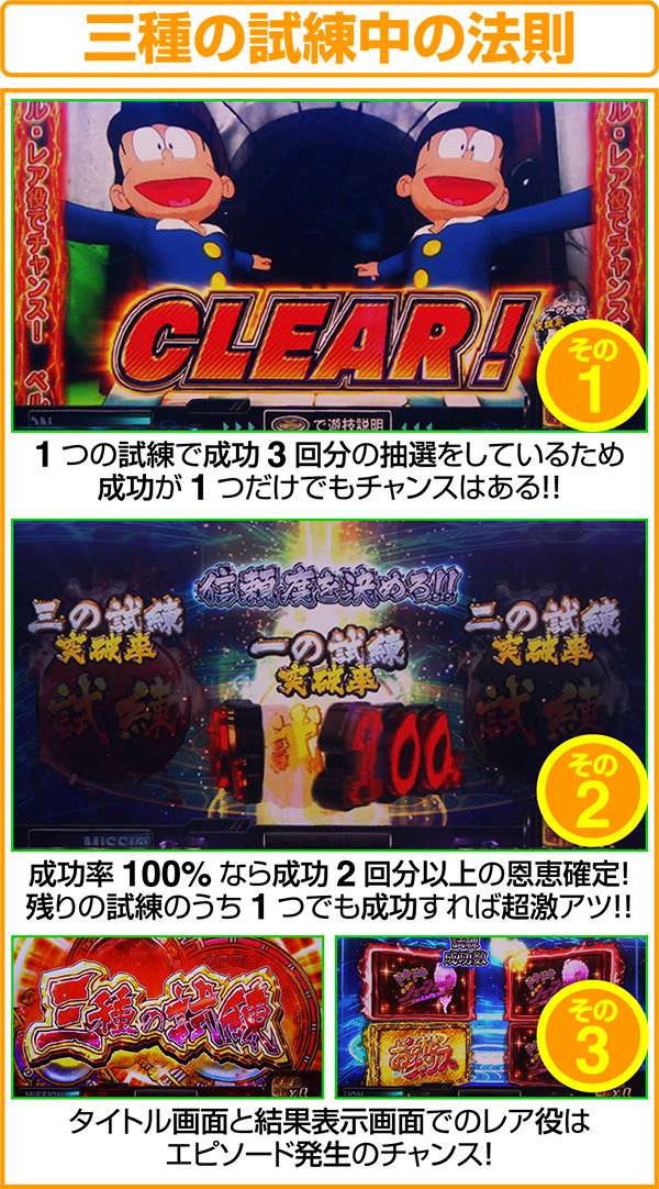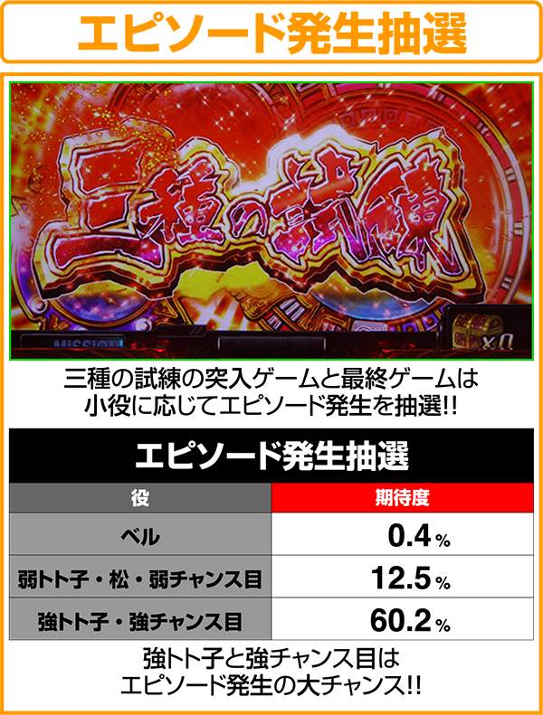 三種の試練の最終ゲームでは、各試練の成否に応じた報酬の抽選と小役によるエピソード発生の抽選をおこなっている。短い区間ではあるが、レア役を引けたらエピソードの発生に期待しよう。