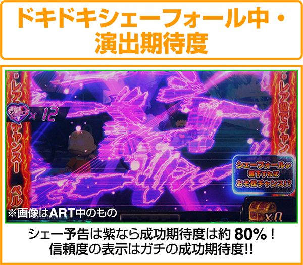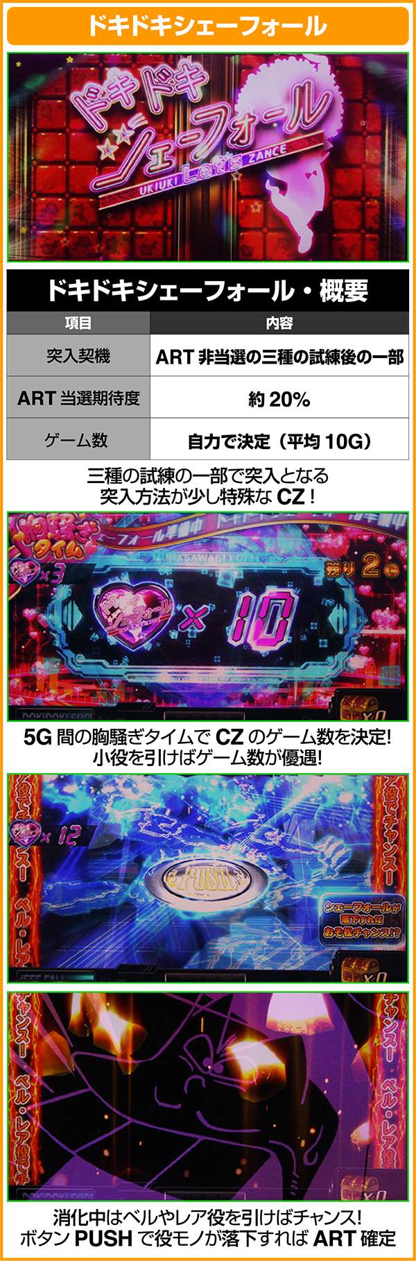 三種の試練のART期待度は約20%とやや低めだが、40%弱でドキドキシェーフォールへと突入するため、失敗してもチャンスが続く可能性がある。
