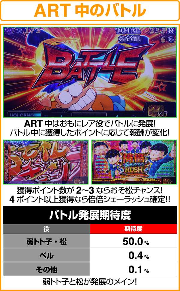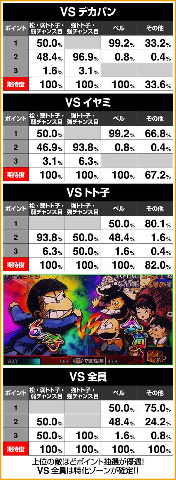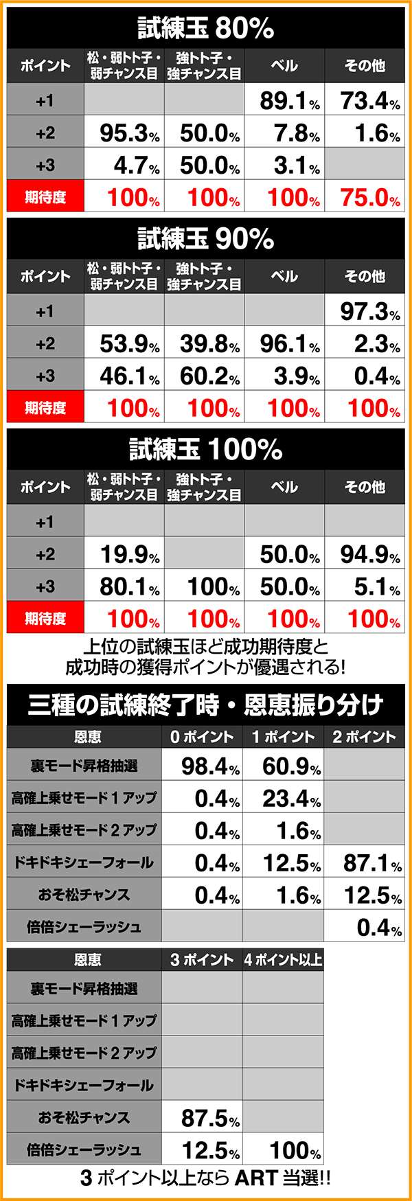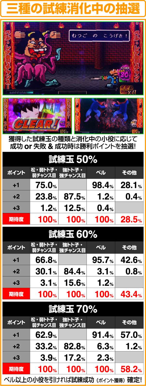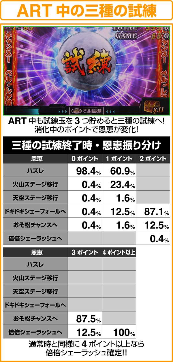 3回の試練で獲得した勝利ポイントの合計で、獲得する恩恵を抽選。3つ合わせて3ポイントに達すればおそ松チャンス(ART)当選が確定し、4ポイント以上なら倍倍シェーラッシュ直撃が確定する。