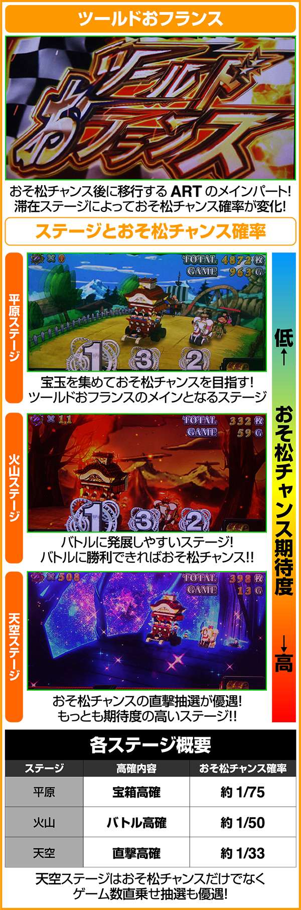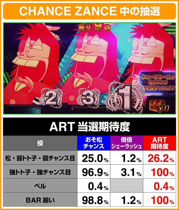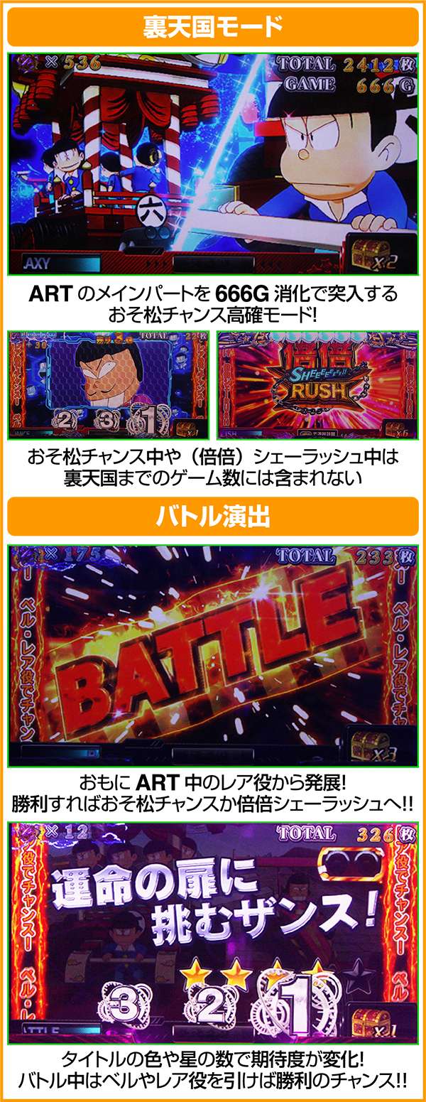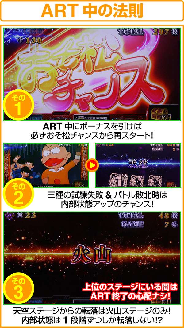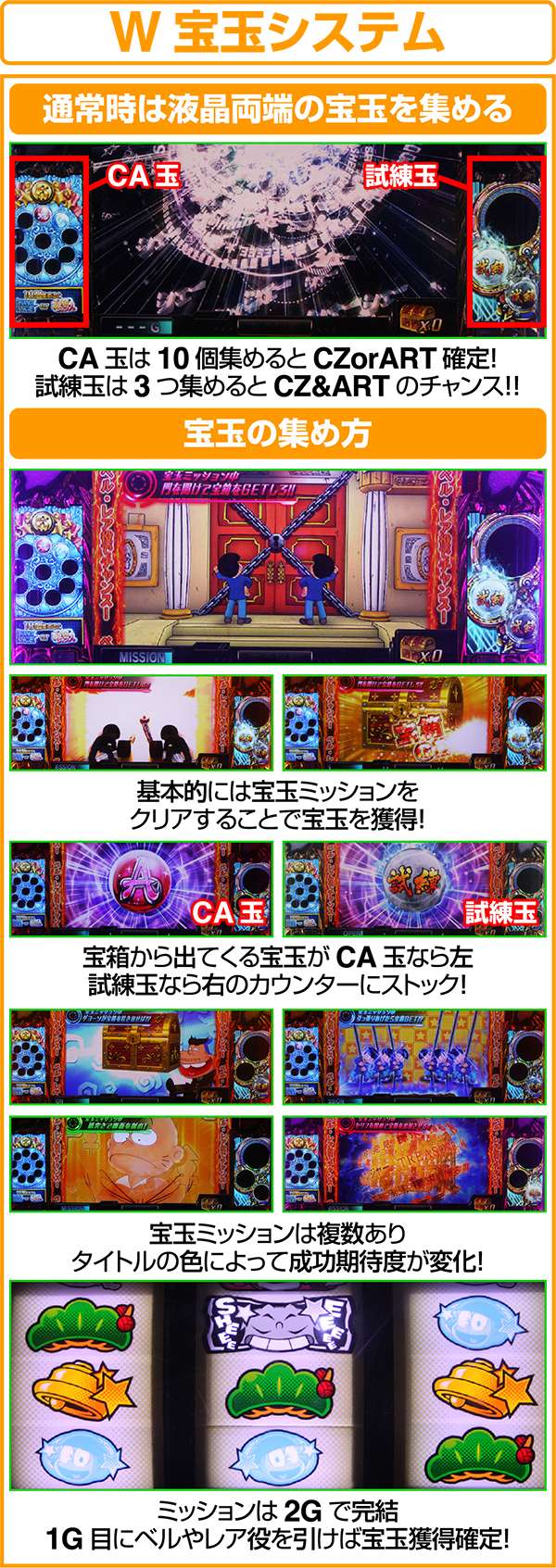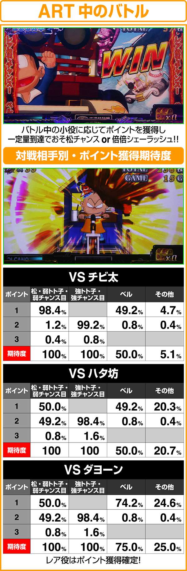 3回の試練で獲得した勝利ポイントの合計で、獲得する恩恵を抽選。3つ合わせて3ポイントに達すればおそ松チャンス(ART)当選が確定し、4ポイント以上なら倍倍シェーラッシュ直撃が確定する。