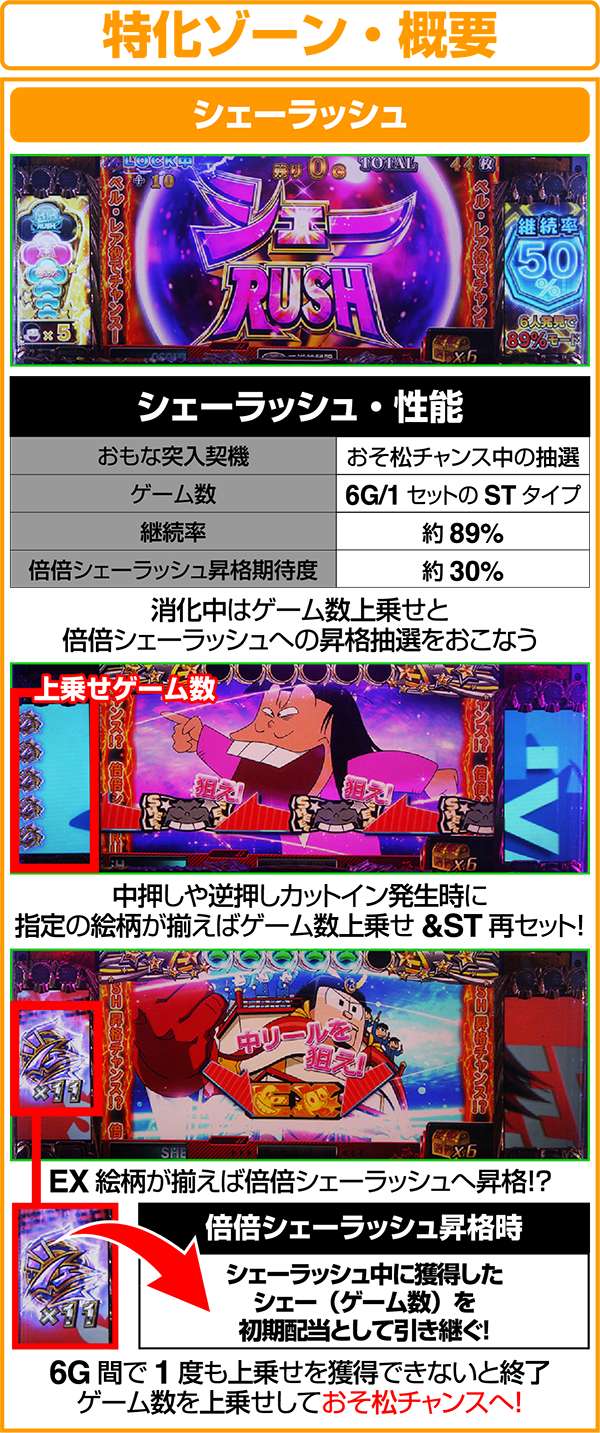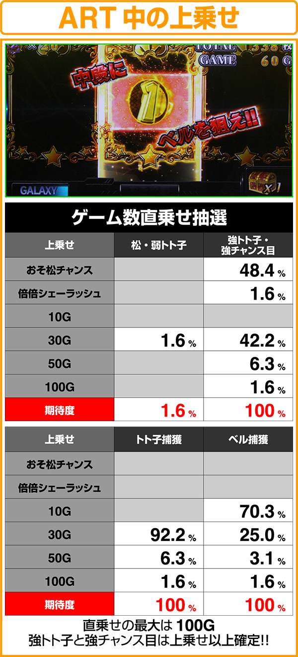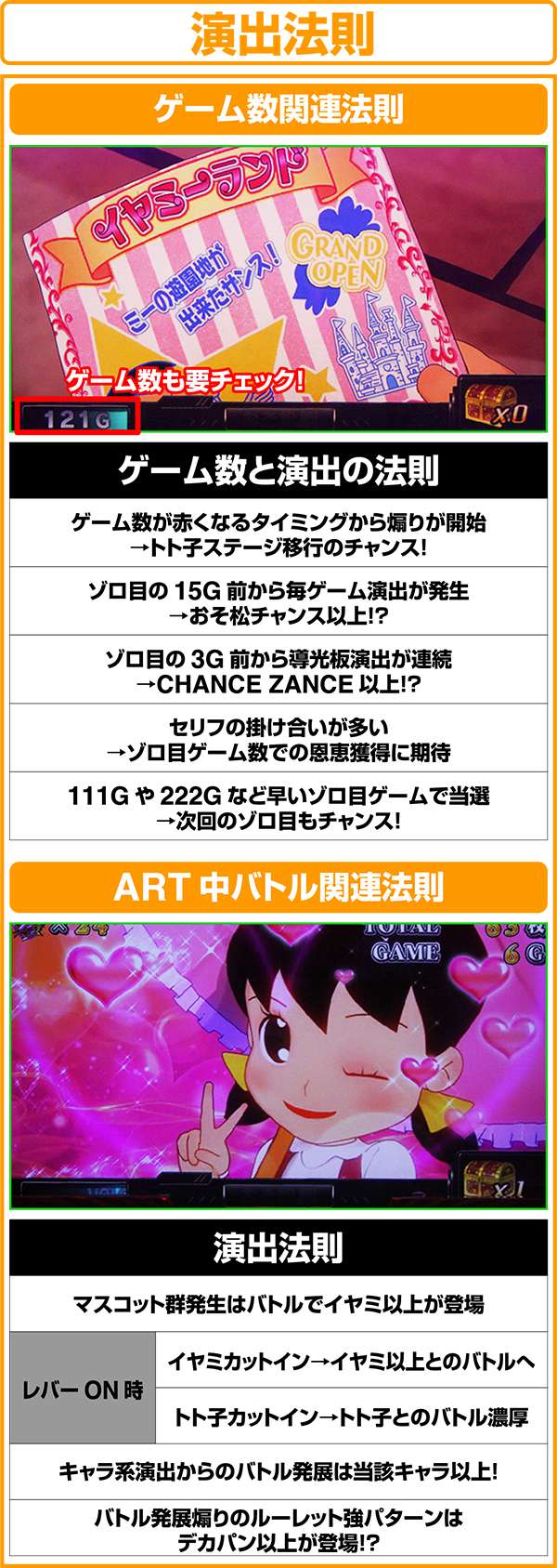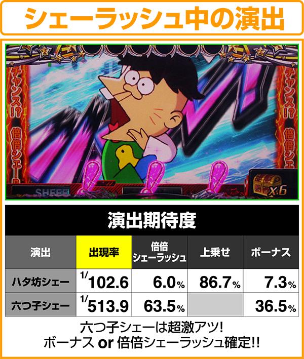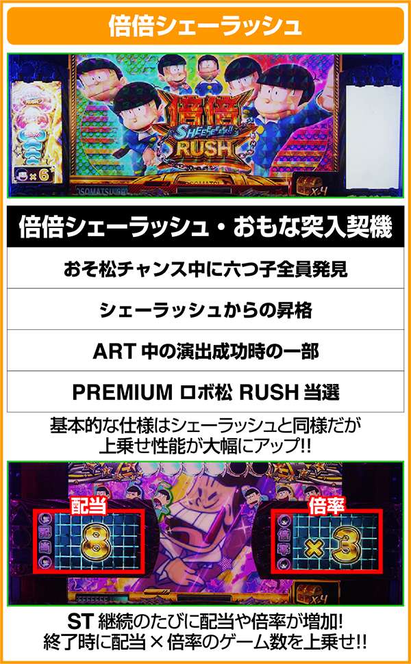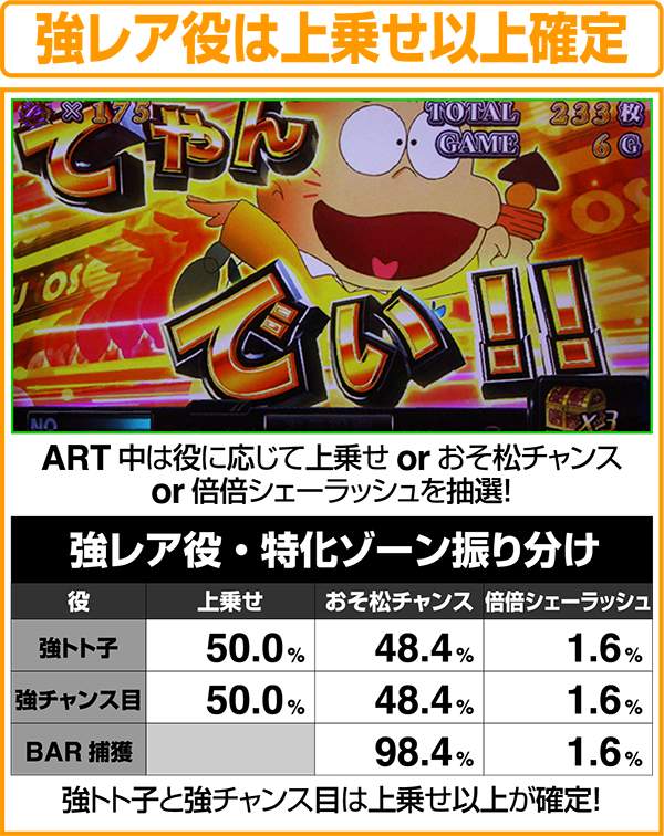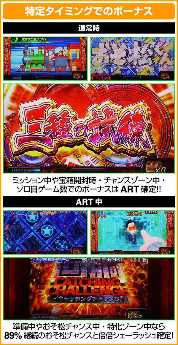 ボーナスを引くタイミングは超重要。とくにART中はタイミングによってはおそ松チャンスと倍倍シェーラッシュのダブル継続率89%が確定となるなど、大量出玉への足がかりとなり得る。上記のタイミングでボーナスを引けた場合は、おおいに期待したいところだ。