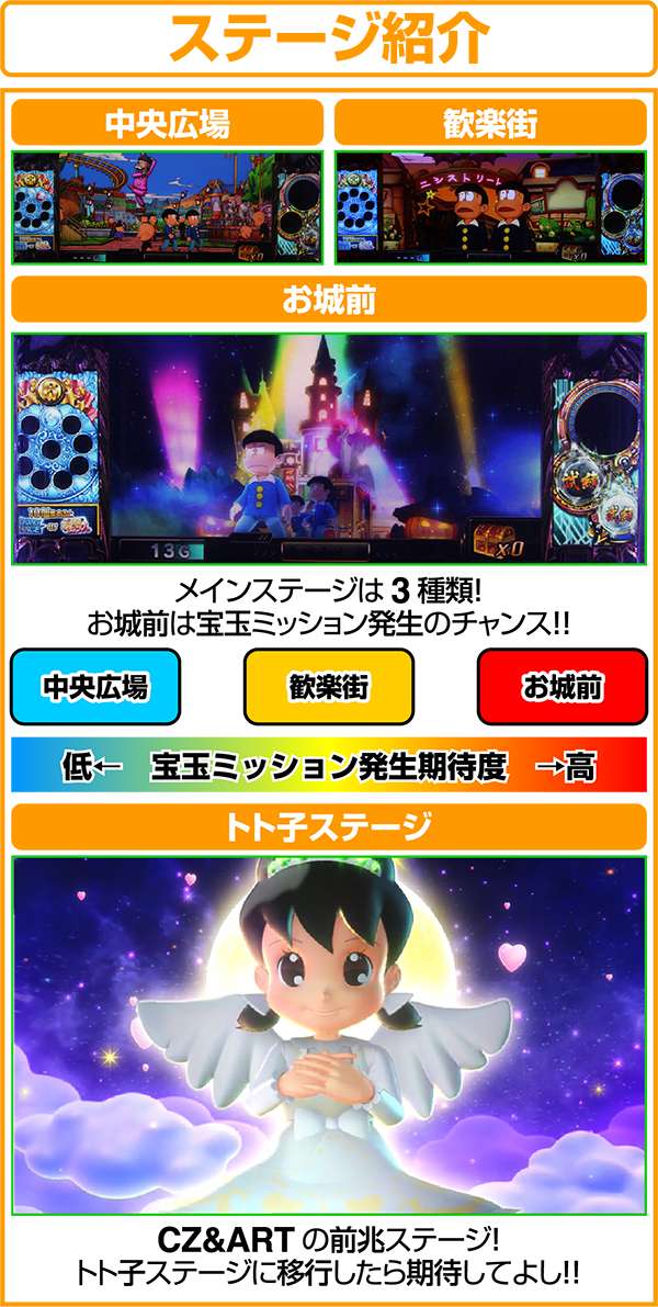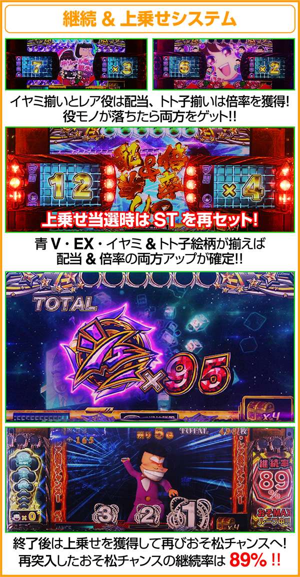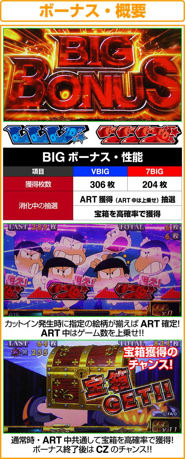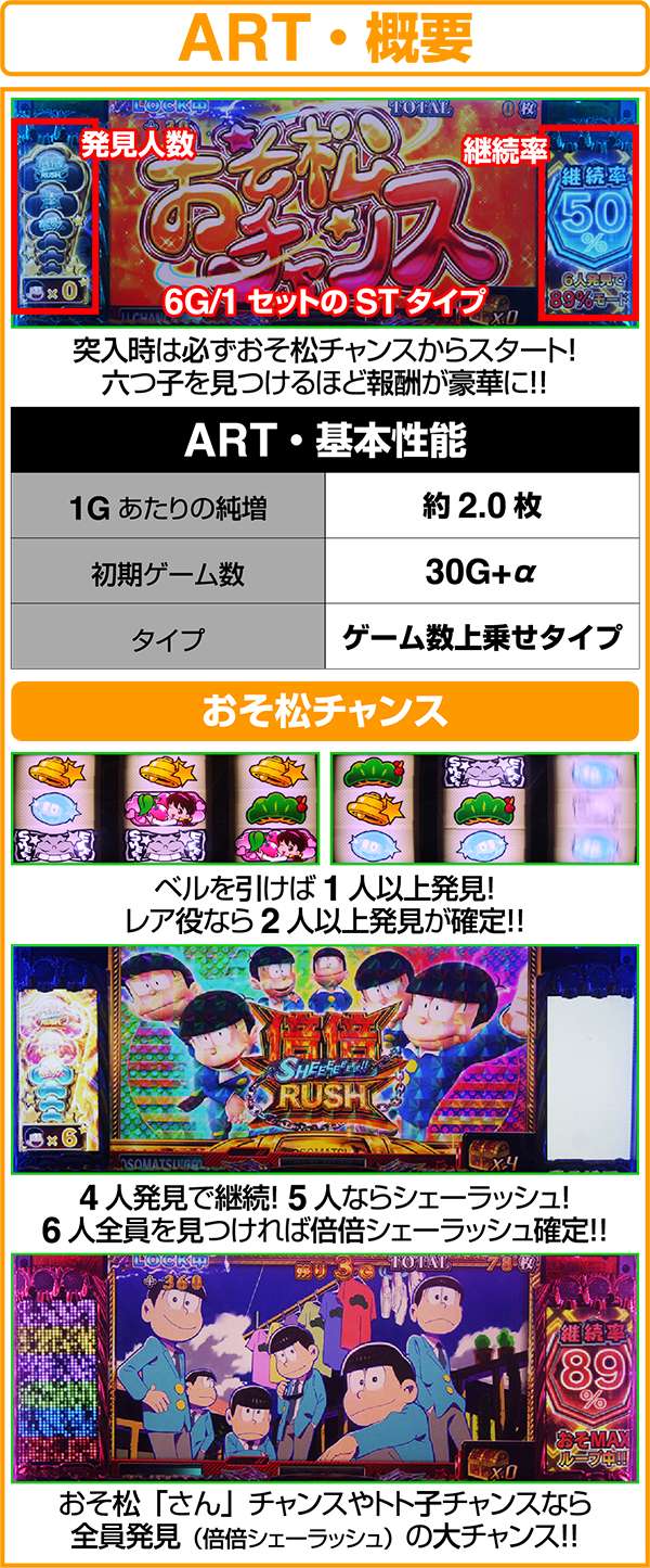 4号機時代に爆裂機として人気を集めた「パチスロおそ松くん」がA+ART機として登場する。 出玉増加のメインとなるARTは純増約2.0枚(ボーナス込み)。ART開始時に突入するおそ松チャンスは最高継続率89%となっており、ゲーム数上乗せ特化ゾーンへの契機のひとつにもなっている。約300枚を獲得できるボーナスも搭載されているなど、大量獲得への夢を多くの面から感じられる1台だ。 |