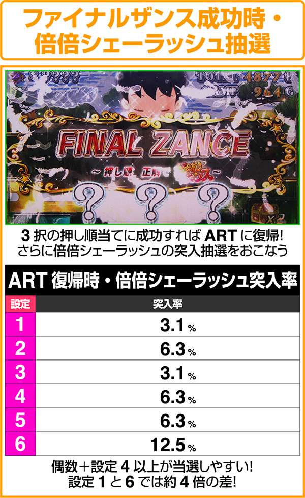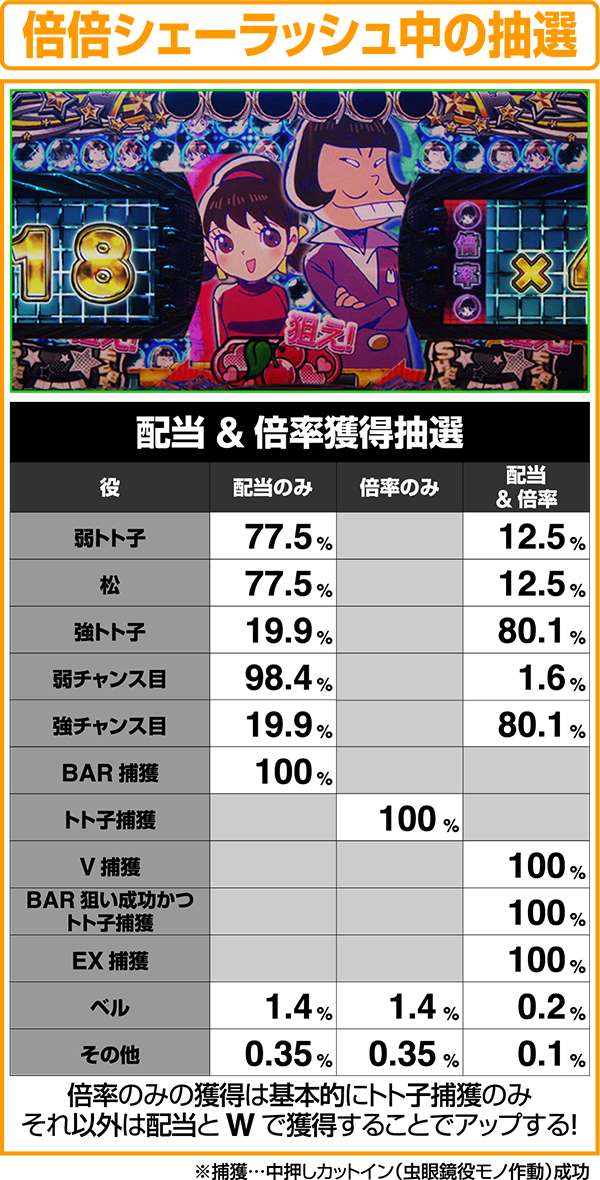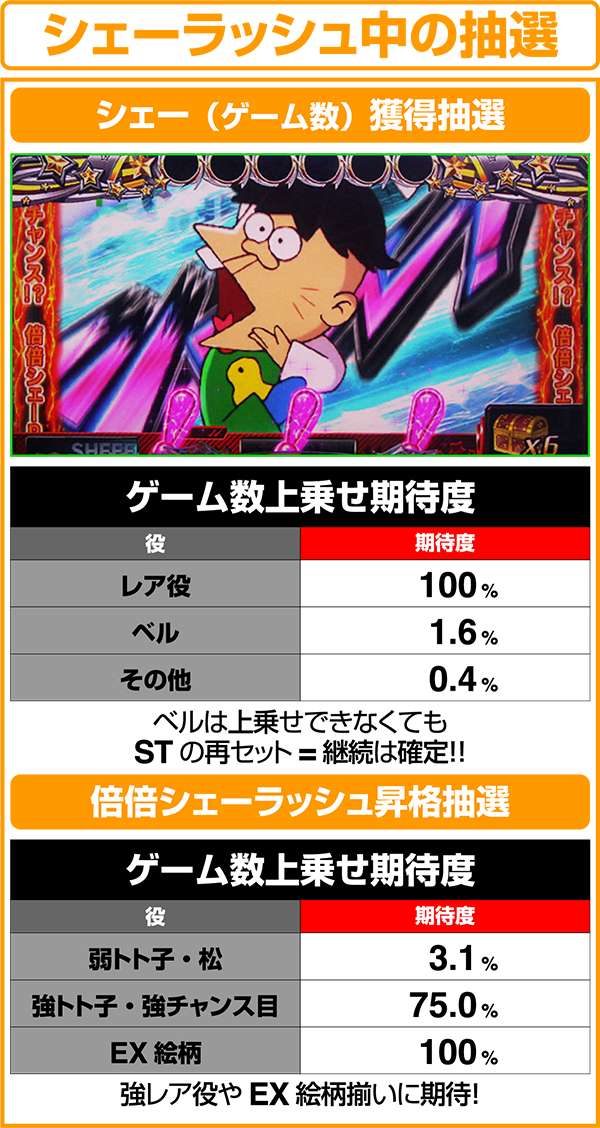 倍倍シェーラッシュ突入時の初期配当は5だが、シェーラッシュから昇格した場合は獲得していたゲーム数を初期配当として引き継ぐため、大量上乗せのチャンス。